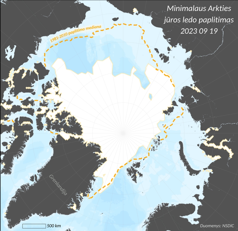 Paveikslėlyje balta spalva pažymėta šio minimalaus Arkties jūros ledo paplitimo riba, o oranžinė linija žymi 1981–2010 m. Arkties ledo minimumo paplitimo medianą. Lygindami paplitimo ribas matome, kad pastaraisiais metais jūros ledas, palyginti su minėtais ankstesniais laikotarpiais, traukiasi.