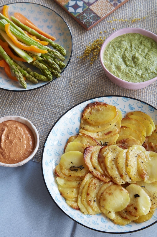 Bulves nuskutame ir supjaustome labai plonais griežinėliais peiliu arba specialia pjaustykle – mandolina. Didelę kepimo skardą išklojame kepimo popieriumi, suguldome bulvių griežinėlius, patepame juos lydytu sviestu, pasūdome, pagardiname pipirais ir čiobreliais. Šauname į 200 °C temperatūros orkaitę kepti 45 min.