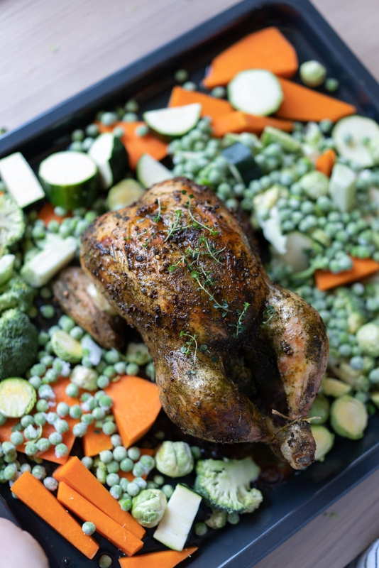 Dėkite vištą į skardą ir kepkite apie 1 val. ar šiek tiek ilgiau. Daržoves supjaustykite, apšlakstykite aliejumi, pagardinkite druska ir pipirais. Prie vištos į skardą suberkite daržoves ir kepkite dar 20–30 min.
