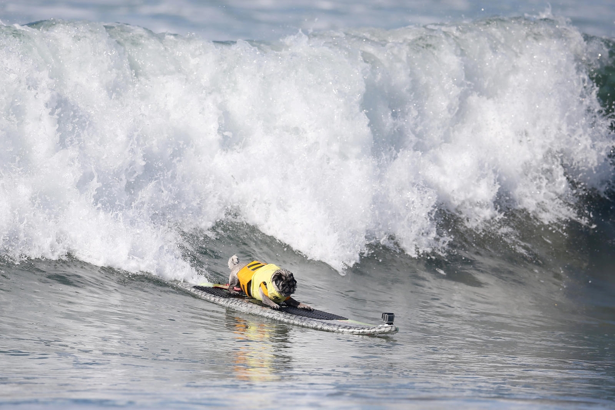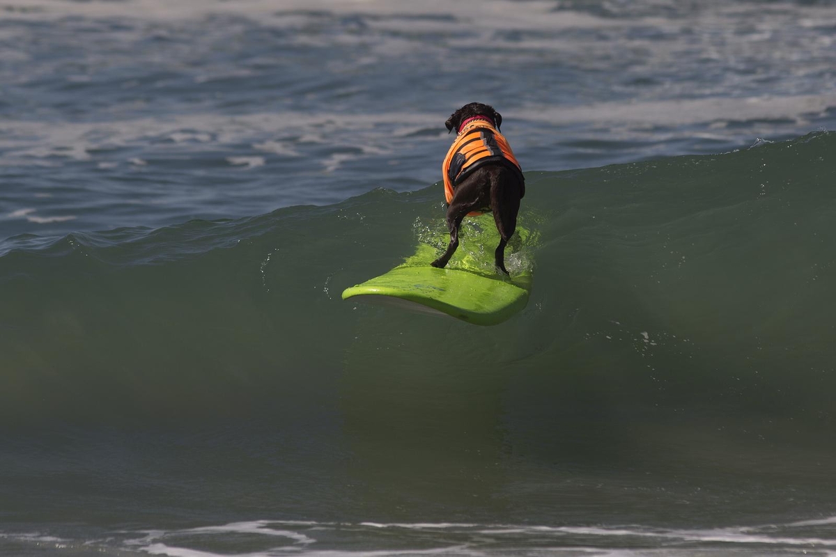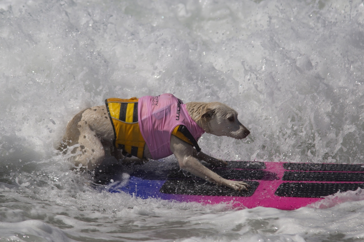 Į penktadienį prasidėjusį jau aštuntą metinį renginį „Surf City Surf Dog“, kuris rengiamas siekiant padėti gyvūnų labdaros fondams, šunys ir jų šeimininkai suvažiavo iš tokių kraštų kaip Florida, Australija ir Brazilija.