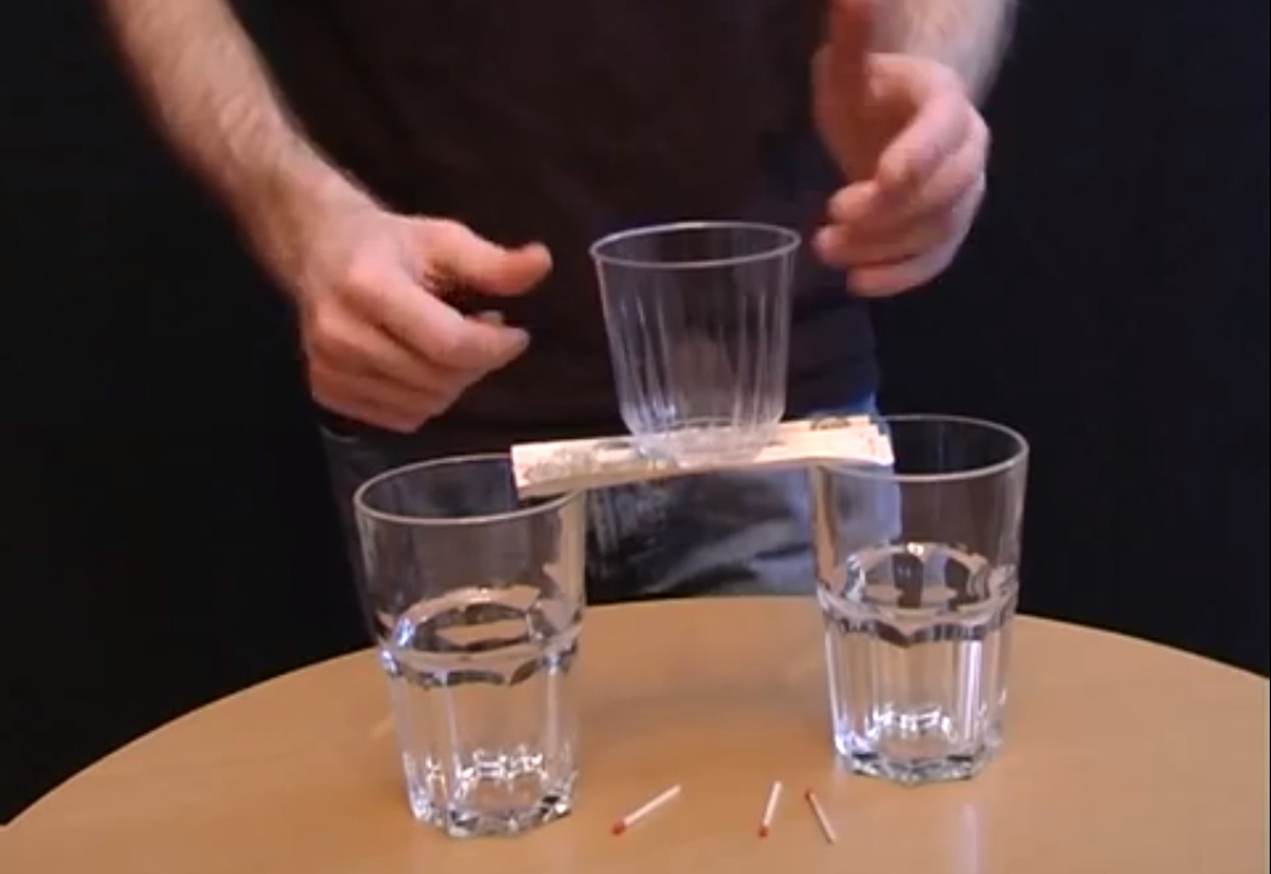 Masinantis triukas – tiltelis iš banknoto. Ant stalo tam tikru atstumu viena nuo kitos pastatykite dvi dideles stiklines, padėkite tris degtukus, piniginį banknotą ir paprašykite pageidaujančiųjų iš to, kas ant stalo, padaryti tiltelį tarp dviejų stiklinių, ant kurio laikytųsi trečia – mažesnė – stiklinė. Kas įvykdys sąlygą, galės pasiimti banknotą. Triuko paslaptis – banknotą reikia išilgai išlankstyti armonikėle ir ją uždėti ant tarpo tarp stiklinių. Išlankstytas banknotas atlaikys mažesnę stiklinaitę.
