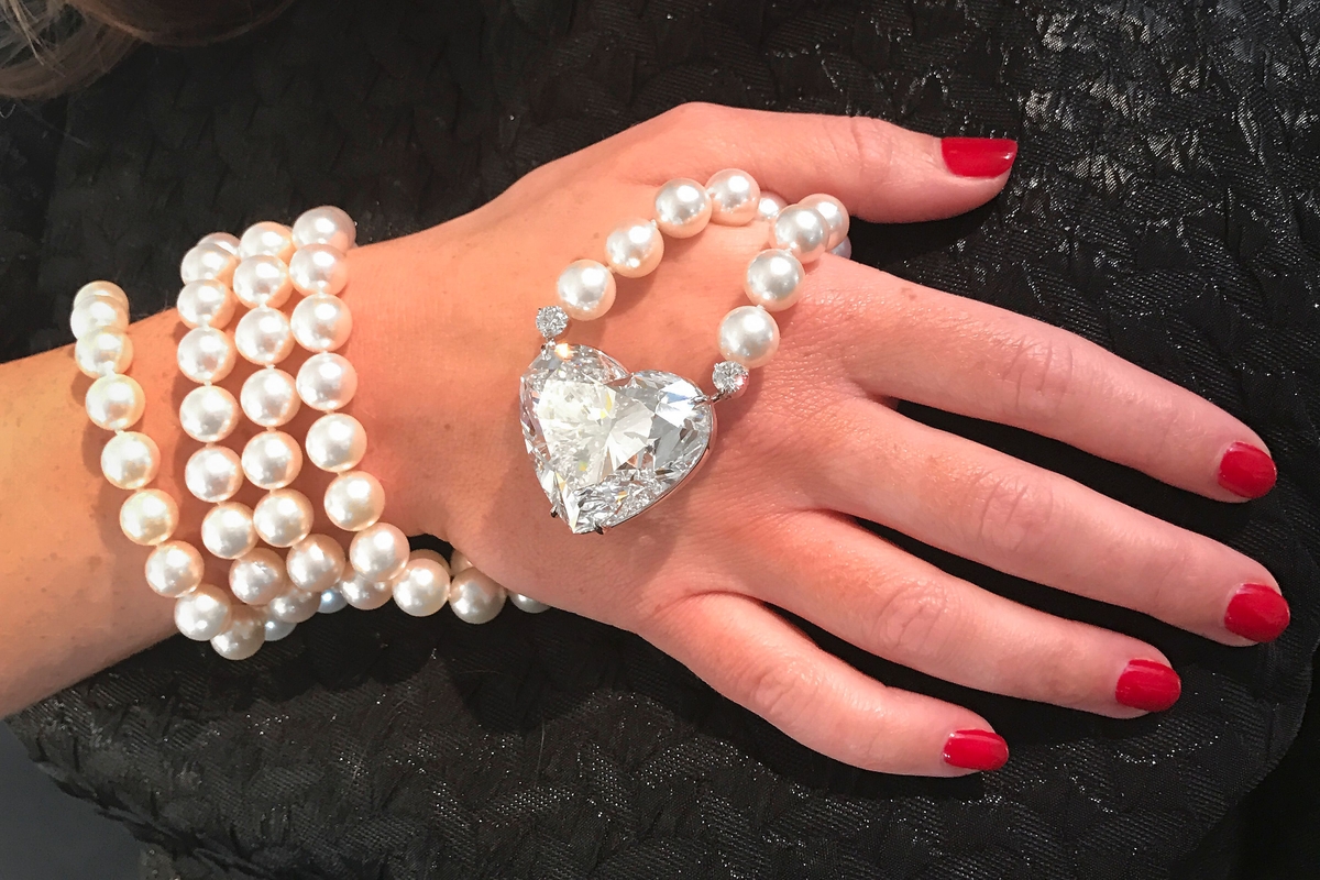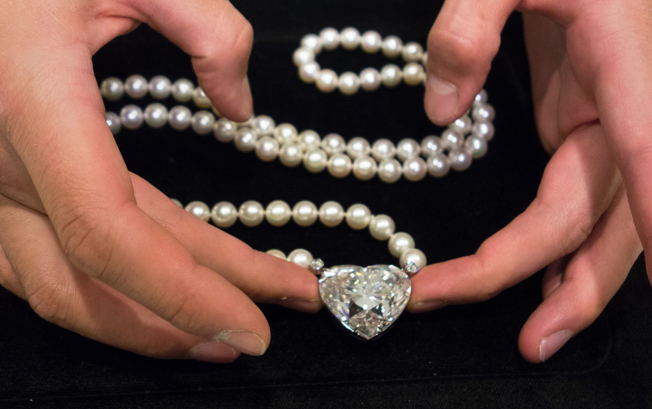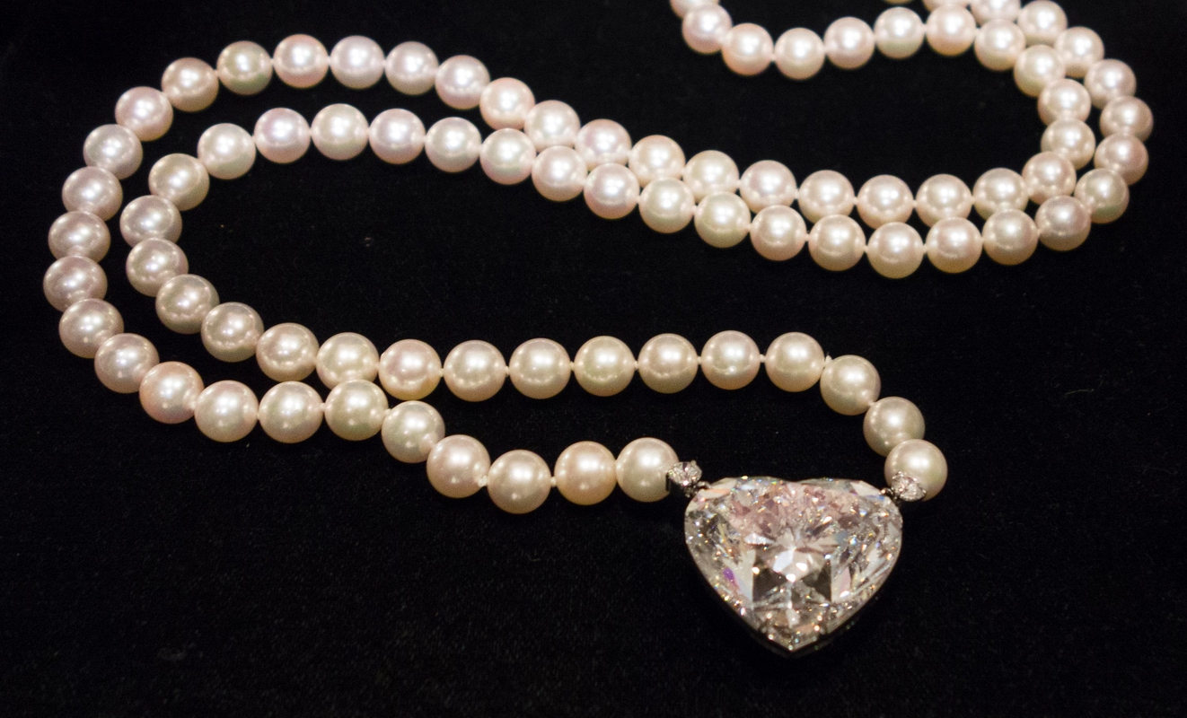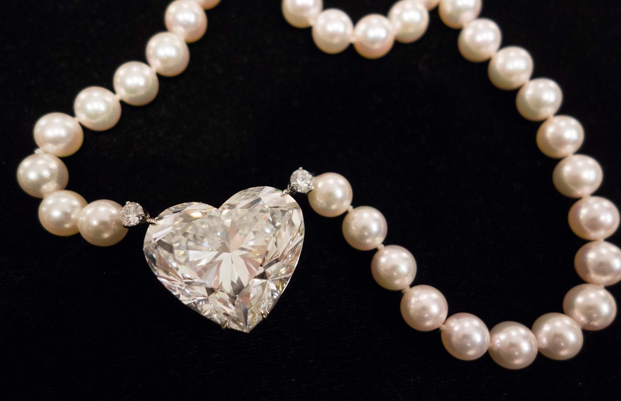 92 karatų pakabutis ant perlų vėrinio bus pagrindinis brangakmenis „Christie's“ pavasario aukcione, gegužės 17 d. vyksiančiame prabangiame viešbutyje „Four Seasons des Bergues“ ant Ženevos ežero kranto.