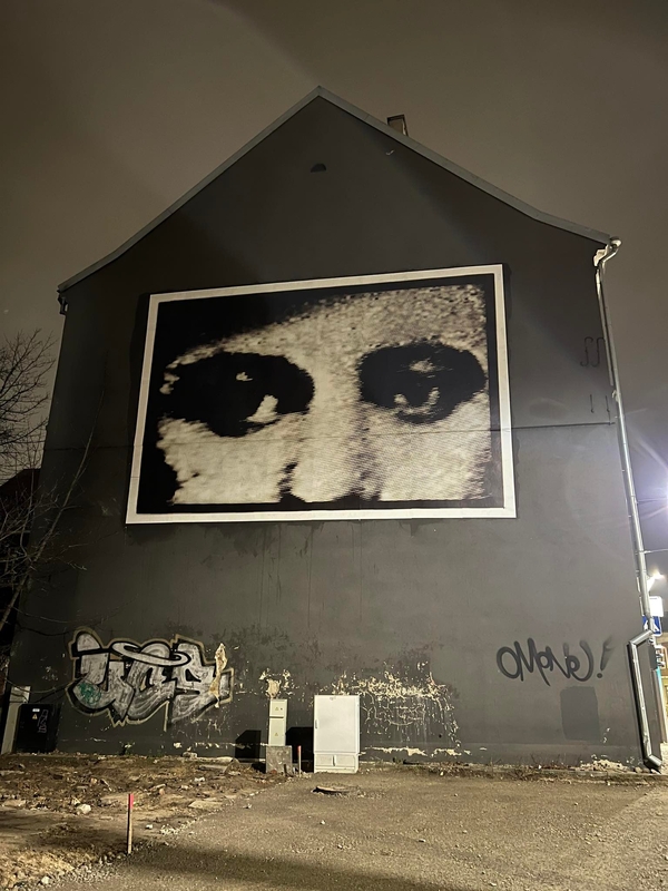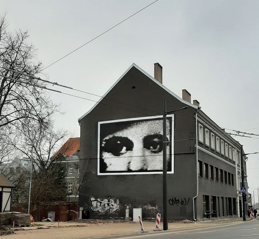 Internete kauniečiai dalijosi mistiško didžiulio plakato, pakabinto Šv. Gertrūdos gatvėje, nuotraukomis. Plakate matyti žmogaus veido fragmentas – dvi tolyn žvelgiančios akys.