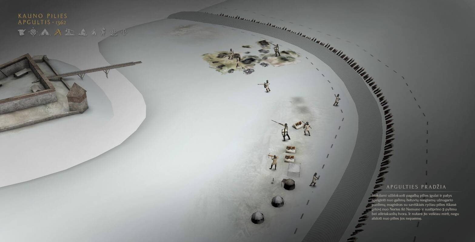 Vizualizaciją sudaro septyni chronologine seka išdėstyti segmentai (scenos). Pirmuosiuose jų pristatomas kryžiuočių ordino žygis link Kauno pilies ir stovyklavietės įrengimas. Drauge su savimi kryžiuočių ordinas gabeno visą to meto amuniciją – arkibalistas, katapultas, trebušetus ir pan., kurią surinkdavo prie Kauno pilies įrengtoje stovyklavietėje ir pasiruošdavo puolimui. Pilies apgulties pradžioje priešai kasė griovius ir, sustiprinę juos pylimu, siekė užblokuoti pagalbą pilies įgulai. Pilies apgulties scenoje atskleidžiama, kokius ginklus naudojo kryžiuočiai, o kokius – pilies gynėjai lietuviai. Paskutinėje vizualizacijos scenoje vaizduojama pilies bokštų, pilies griūtis ir apgulties pabaiga – priešų atsitraukimas.