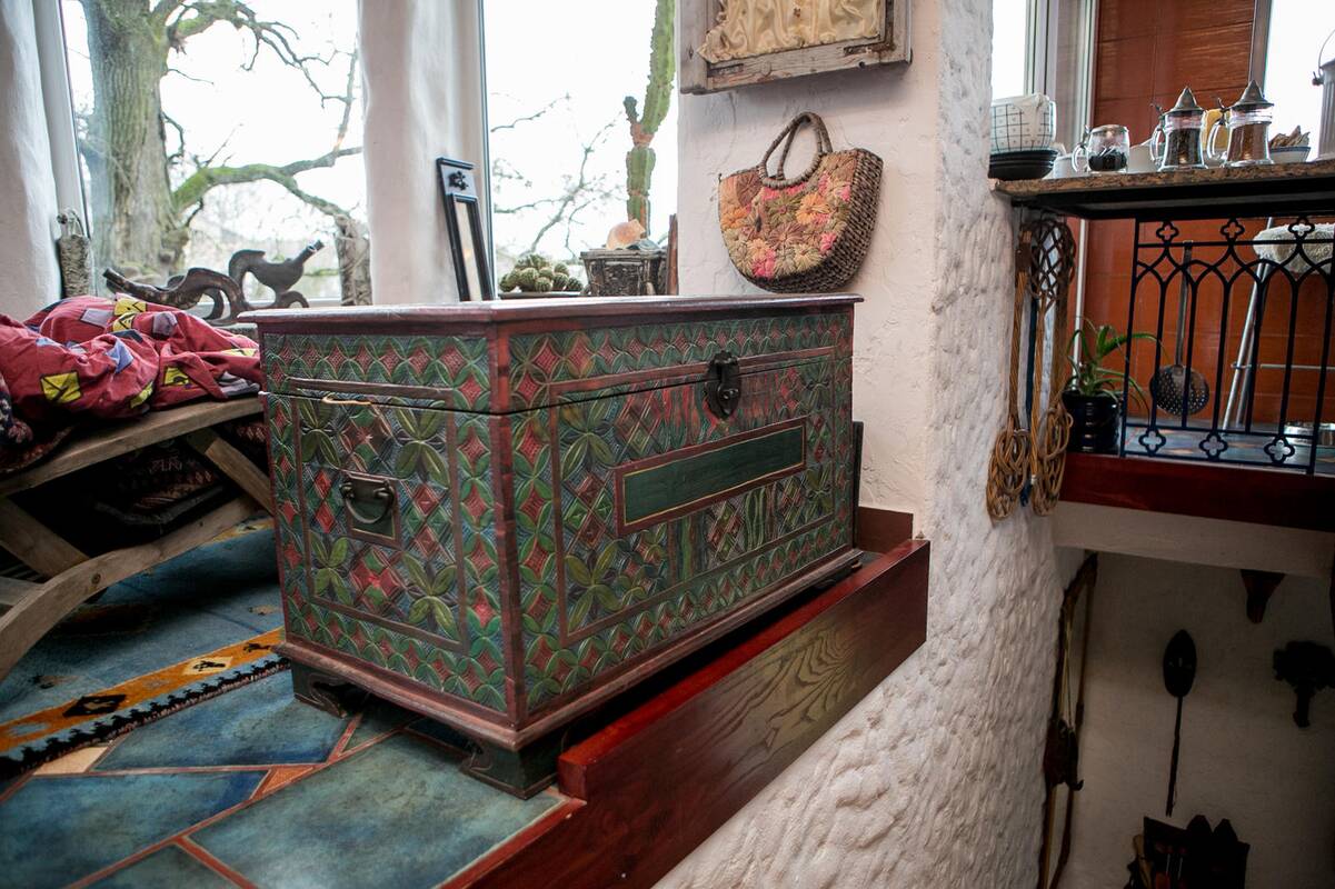 Šių nepaprastų namų interjere senoviniai klasikiniai baldai, močiutės kėdės, iš jos siuvimo mašinos padarytas stalas dera su naujo stiliaus virtuvės komplektu ir iš Indonezijos atgabentomis spintelėmis, bufetu ir skrynia, kurie stebuklingo atsitiktinumo dėka ištapyti lietuviškų lovatiesių raštus primenančiais motyvais. Kūrybinėje dirbtuvėje – ne tik televizorius, patogi lova ir stalas, prie kurio smagu priimti svečius, bet ir stovi grafikos staklės, didžiulė, pačios Jolantos sumontuota, nušlifuota ir nulakuota sieninė lentyna, kurioje apstu vietos menams, darbo reikmenims, senoviniams rakandams. Laiptų atitvaro ažūras – senamiestyje rastos išmestos balkono grotelės, kurias šeimininkė kruopščiai nušveitė ir nudažė, ant vieno lango karnizo – dvi visiškai skirtingos užuolaidos, viena jų – ryškiaspalvis prisiminimas iš kelionės po Maroką.
