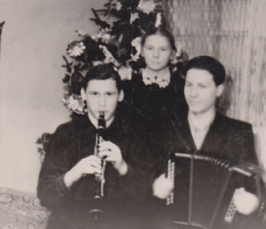 Pragiedruliai: Vytautas Putna (fleita), kaimynas tremtinys Romas Lisauskas (armonika) ir dainininkė Aldona Putnaitė koncertuoja saviškiams per 1957 metų Kalėdas Sibire. / A. Putnaitės archyvo nuotr.