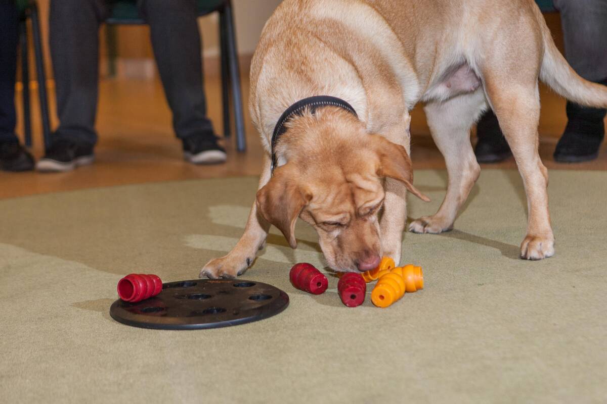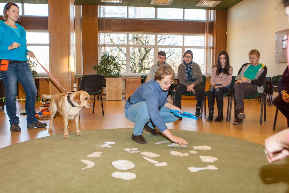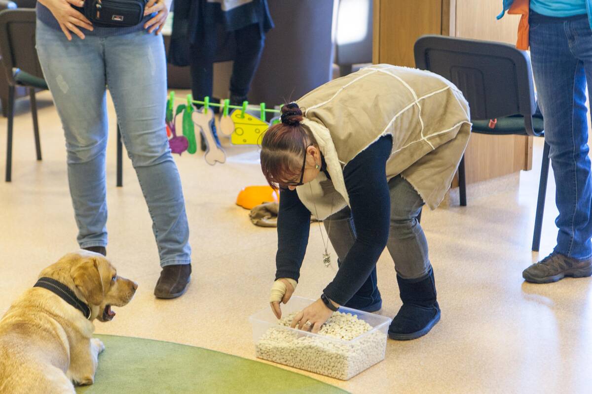 Labai nuotaikingai užsiėmimo dalyviai sutiko tai, kaip Kia vykdė iš pradžių jos šeimininkės, o paskui – tas pačias jų duodamas komandas. Žinoma, už tai buvo privalu pavaišinti šunį skanėstu, kurį reikėjo surasti kruopų dėžutėje (tokiu būdu lavinama susitikimo dalyvių smulkioji motorika, lytėjimo pojūčiai). Susitikimo dalyviai ir šio žaidimo metu net neįtarė, kad jiems mokant šunį komandų, stiprėjo jų pačių savivertė, savarankiškumas, pasitikėjimas savimi.
