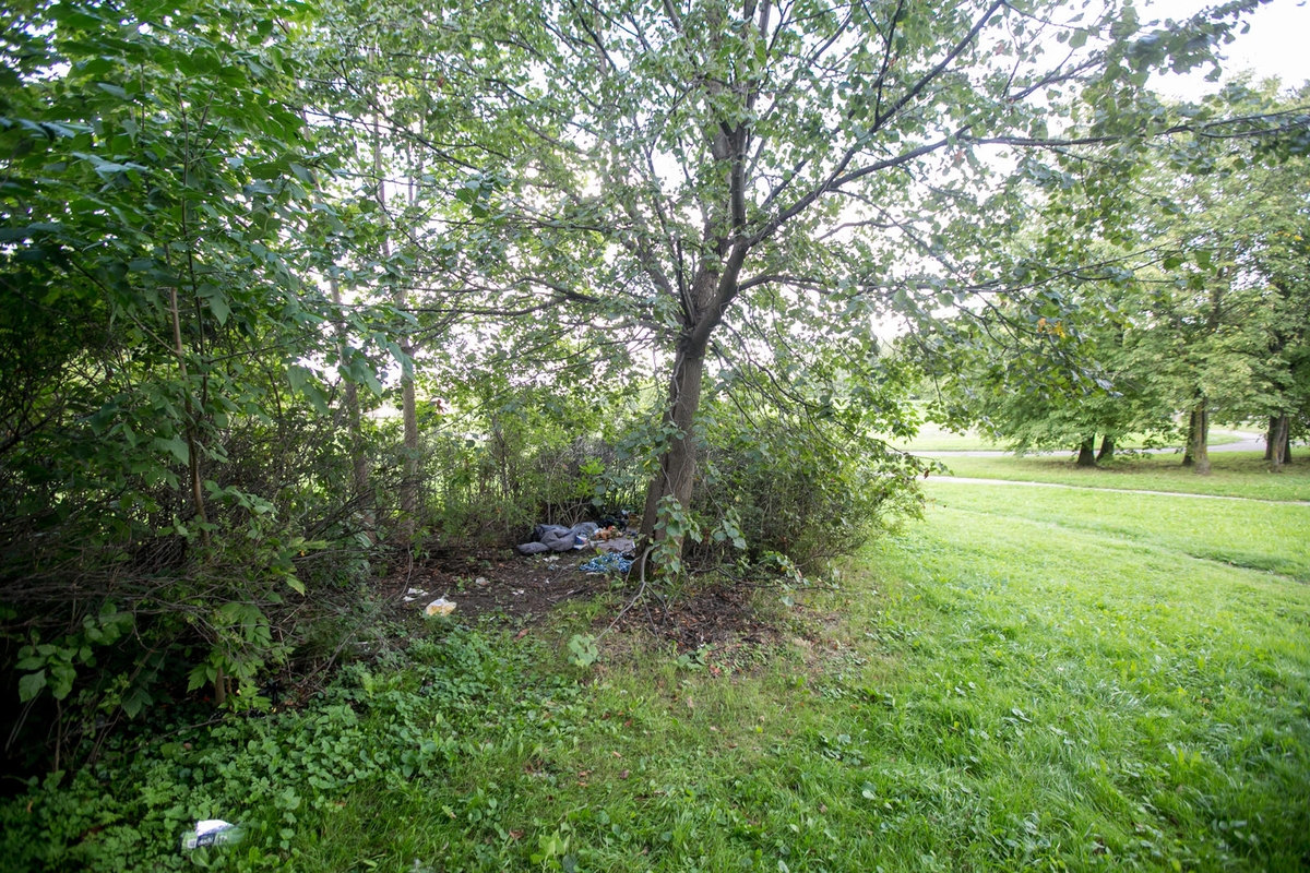 Prie išpuoselėto Dainavos parko želiančiuose krūmynuose jo gyventojų neradome – jie buvo palikę savo kartoninėmis dėžėmis, dėvėtais drabužiais nuklotas lindynes. Jų aplinka prišnerkšta ir bjauriai pridergta – reikėjo atidžiai žiūrėti, kur statai koją. Benamių "miegamajame" mėtėsi vaikiški minkšti žaislai (gal naktį jie atstodavo pagalves?), vaikiška avalynė (neįminėme jos paskirties mįslės), spirituoto gėrimo tušti buteliai, maisto atliekos.