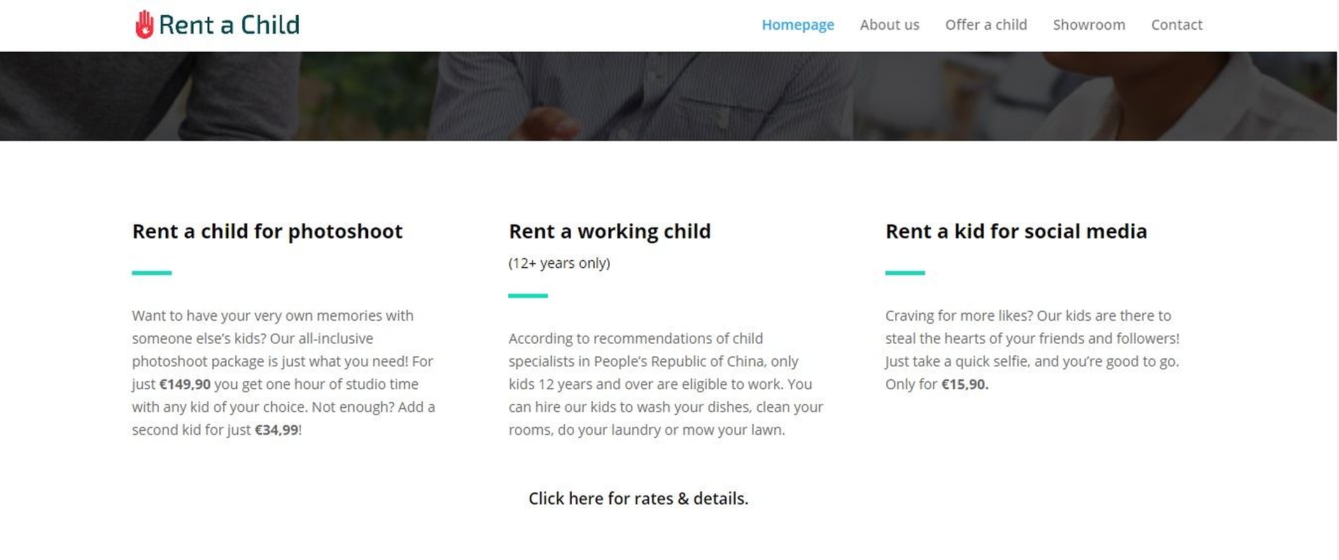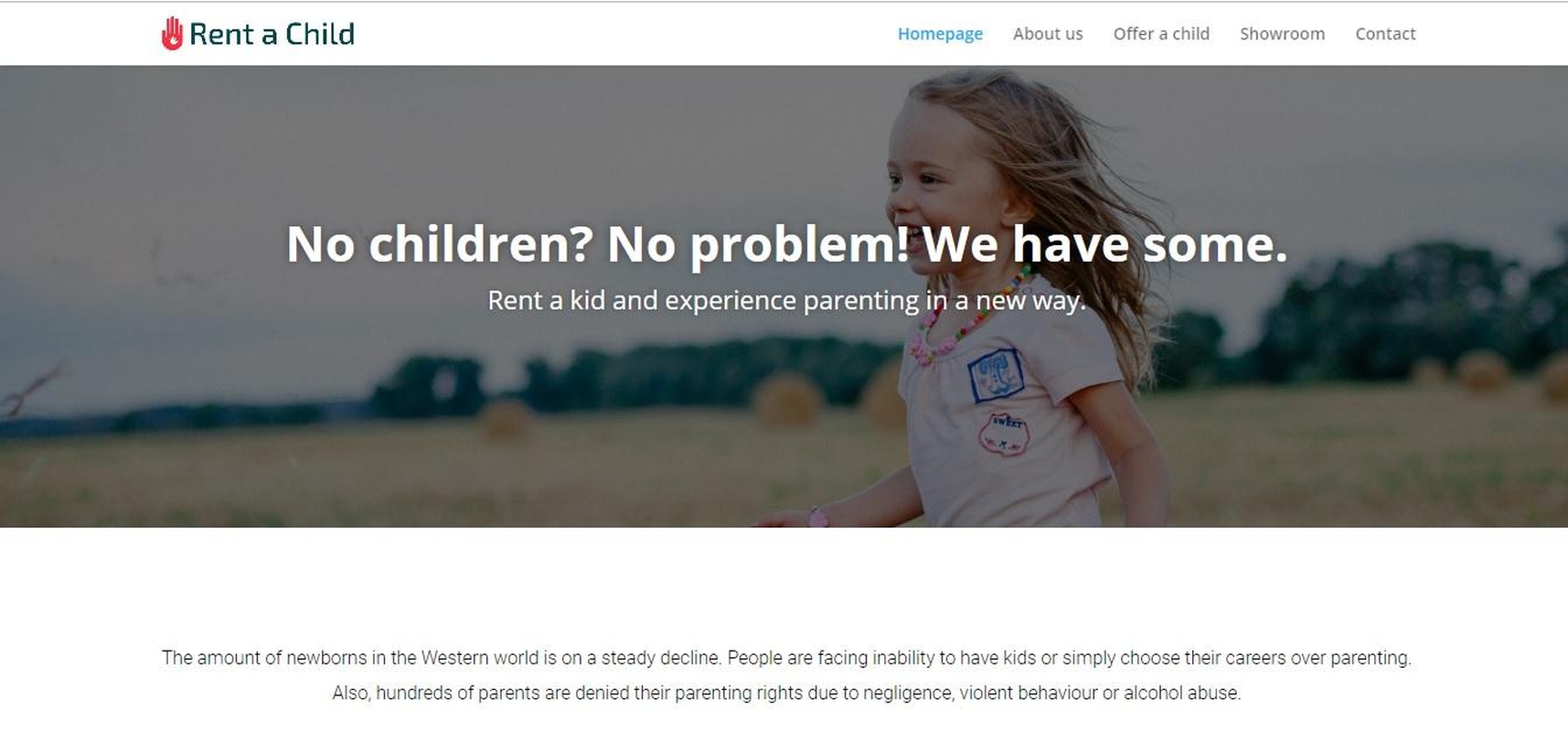 Minėtoje svetainėje anglų kalba nurodoma, kad nereikia jaudintis, jei šeima neturi vaikų, juos lengvai galima išsinuomoti. „Neturi vaikų? Ne bėda! Mes turime keletą. Išsinuomok vaiką ir patirk tėvystę nauju būdu“, – skelbiama svetainės pagrindiniame puslapyje.