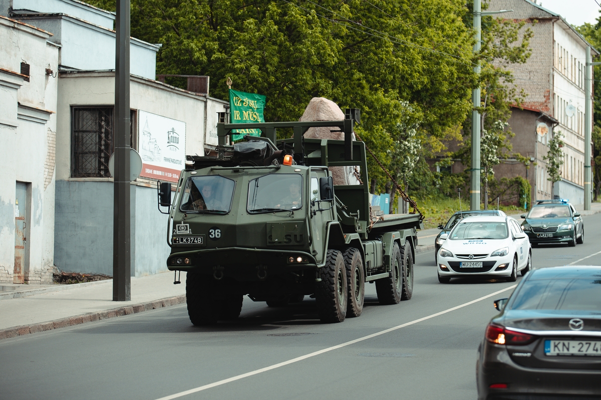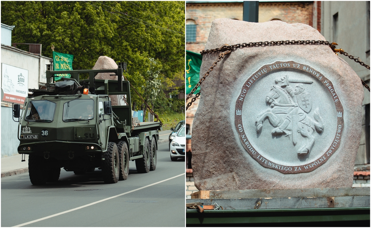 Ankstų ketvirtadienio rytą paminklas buvo iškeltas iš Utenos rajone, Siručių kaime esančio Jono Šimonėlio skulptūrų parko. Lydimas Aukštaitijos baikerių klubo, akmuo pajudėjo link Kauno, o iš čia tiesiai į Lenkiją. Kirtus sieną koloną pasitiko būrelis Punsko lietuvių. Norinčių, anot P.Vaisietos, buvo ir daugiau, tačiau skaičių ribojo karantino suvaržymai. Dėl tos pačios priežasties atsisakyta ir didelių iškilmių Griunvaldo lauke. Pastatytas į savo vietą, paminklas bus atidengtas liepos 15-ąją minint 610-ąsias Žalgirio mūšio pergalės metines.