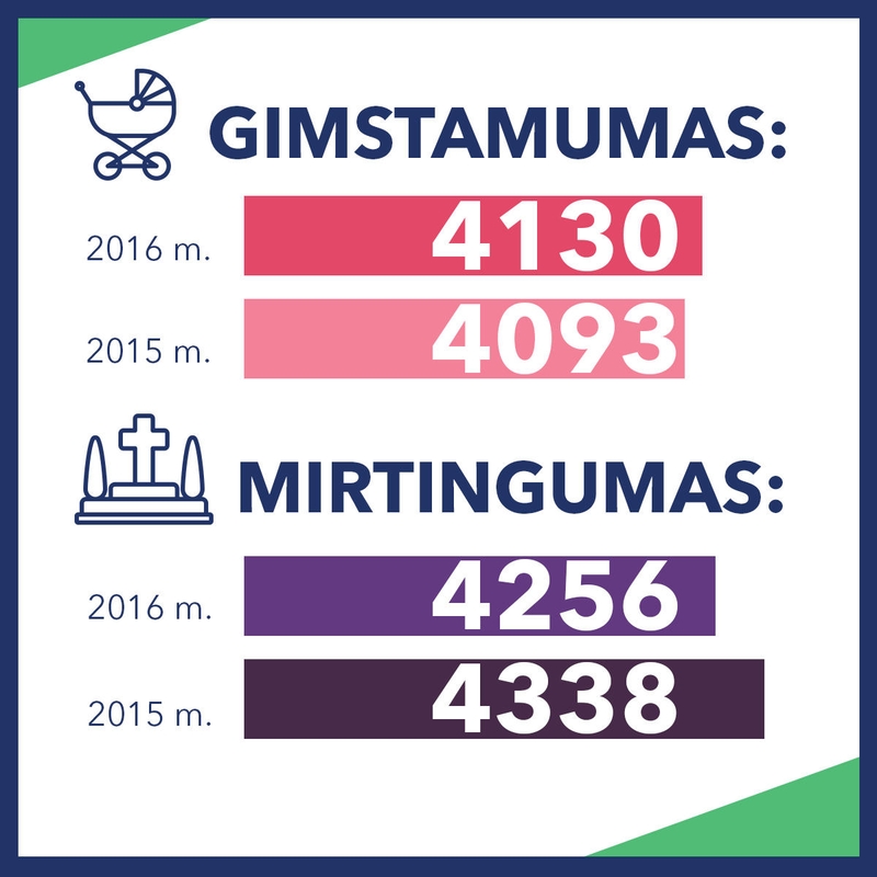2016-aisiais Kaune gimė 0,9 proc. daugiau naujagimių (2016 m. – 4130, 2015 m. – 4093) ir mirė 1,9 proc. mažiau žmonių (2016 m. – 4256, 2015 m. – 4338) nei 2015-aisiais.