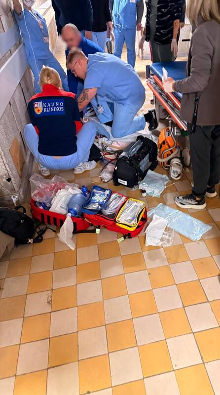 „Atvykus Skubios pagalbos ir Intensyvios terapijos skyrių personalui, buvo tęsiamas specializuotas gaivinimas: pacientas intubuotas, prijungtas prie kardiomonitoriaus, kuriame stebėtas skilvelių virpėjimas, todėl kelis kartus atlikta defibriliacija. Gaivinimas buvo sėkmingas – pacientas netrukus atgavo sąmonę. Vėliau jam diagnozuotas miokardo infarktas. Atlikus širdies kraujagyslių angiografiją, nustatyti kelių kraujagyslių užsikimšimai. Po stentavimo širdies kraujotaka buvo atstatyta, paciento būklė stabilizavosi. Svarbu pabrėžti, kad dėl laiku ir tinkamai atliktų veiksmų pacientas atgavo sąmonę – tai leidžia tikėtis, jog staigi klinikinė mirtis nesukėlė reikšmingo neurologinio deficito“, – feisbuke rašė medikai.