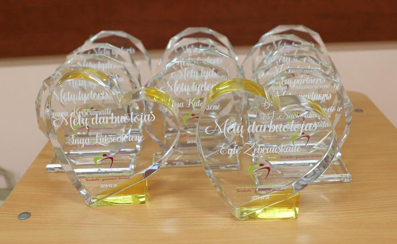 Aktyviausioms biuro darbuotojoms įstaigos vadovas įteikė padėkos ženklus – širdies formos kristalus.