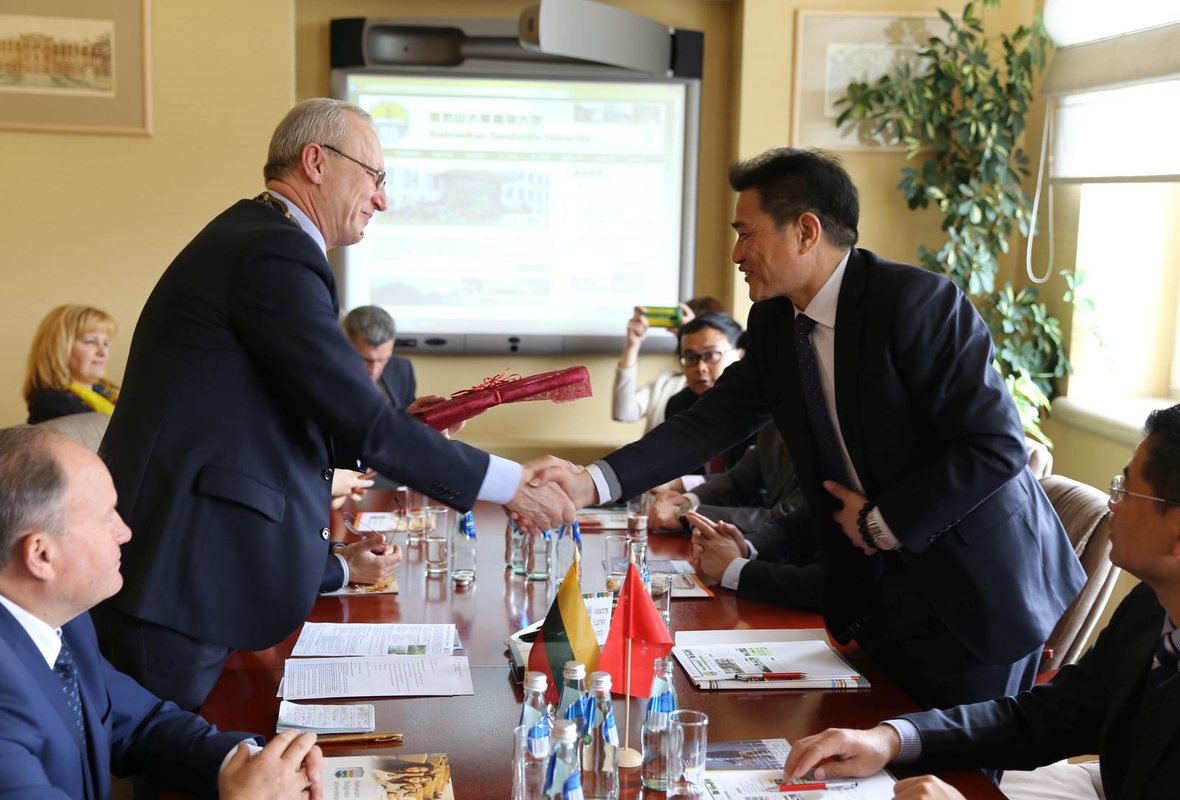 Rektorius Antanas Maziliauskas svečiams pateikė staigmeną – kinų kalba sukurtą universiteto interneto svetainę ir specialų lankstinuką apie šią aukštąją mokyklą.