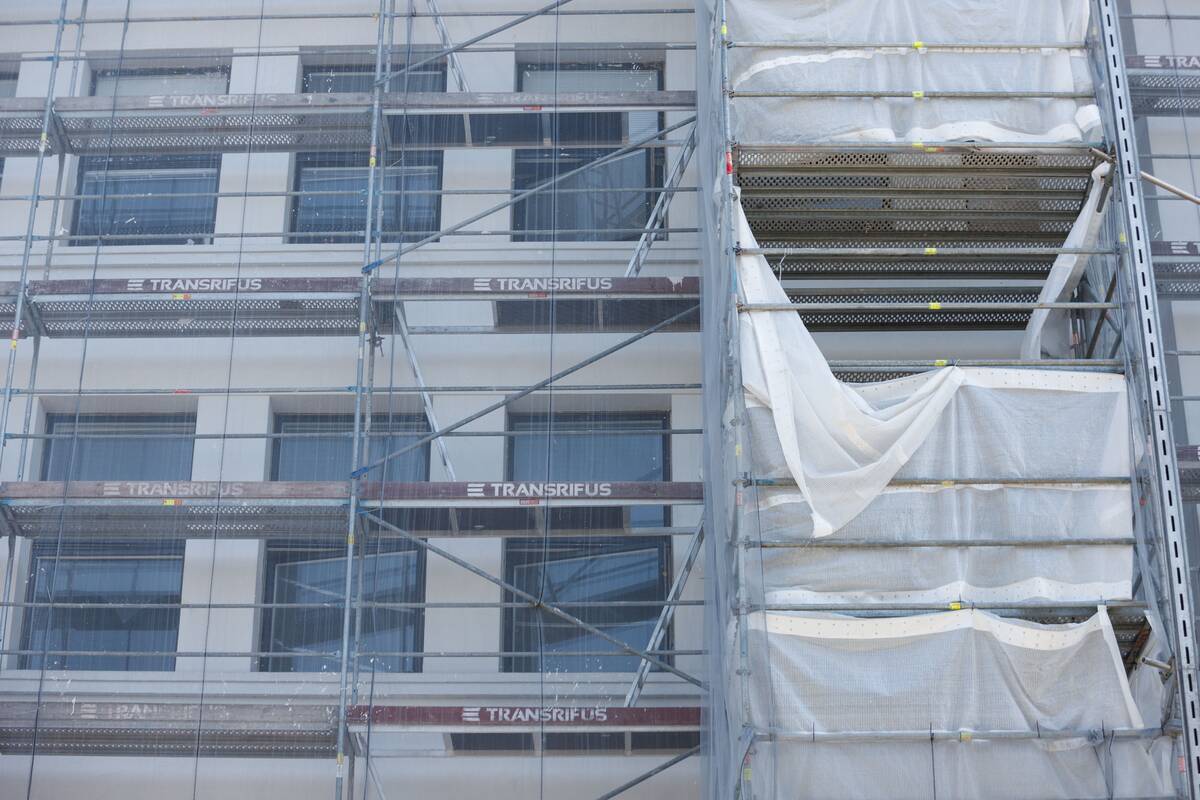 Nedirba: kol kas reprezentacinį Kauno pastatą dengia pastoliai ir tinklas, kurio dalį jau plaiksto vėjas, o darbininkų nematyti. (Edgaro Cickevičiaus nuotr.)
