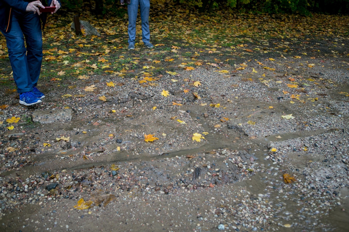 Trečiadienio popietę į įvykio vietą nuvykęs portalo fotoreporteris užfiksavo kvapą gniaužiančius vaizdus – žemių ruožas netoli Piliakalnio gatvės asfaltuotosios dalies vaikštant linguoja tarsi guminis, o vanduo čia ir toliau veržiasi nesustabdoma srove. Tenykščiai neslėpė besibaiminantys, jog jei nebus skubiai imtasi veiksmų, likviduosiančių problemą, vandens perteklius gali pradėti semti ir važiuojamąją kelio dalį.