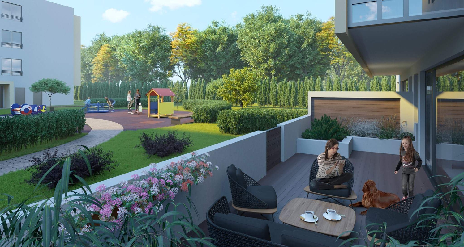 Kvartalo kieme suprojektuotos žaidimų aikštelės, pavėsinės, lauko treniruoklių zonos, želdiniai, jaukus apšvietimas, suoliukai, pasivaikščiojimo takai.