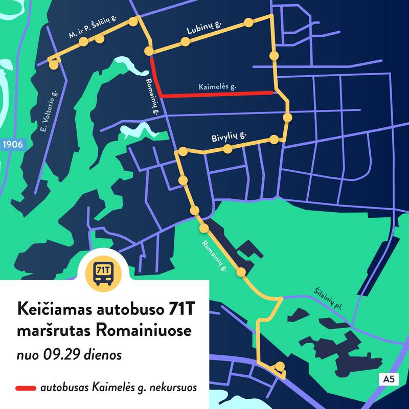 Nuo rugsėjo 29 d., pirmadienio, keičiasi 71T autobuso maršrutas. Nuo šiol jis kursuos nebe Kaimelės, o atnaujinta Lubinų gatve.