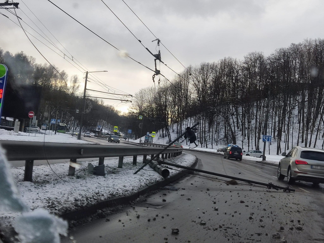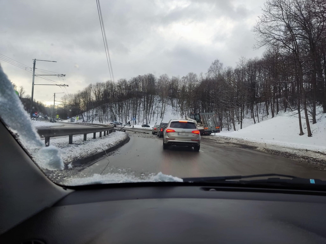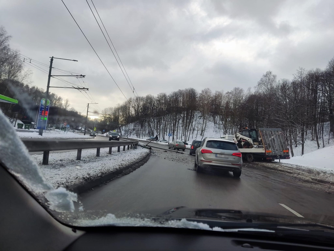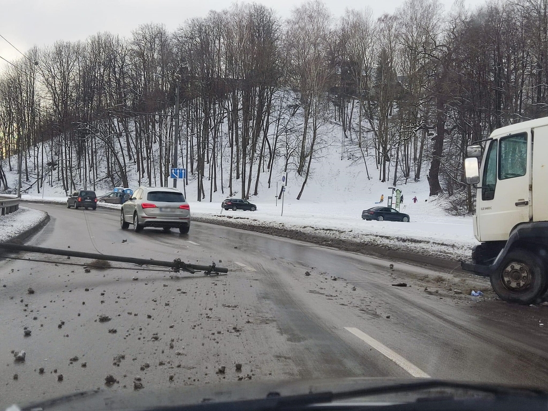 Jų atsiųstose nuotraukose užfiksuota ant Tunelio gatvės važiuojamosios dalies nuvirtusi dalis troleibusų linijos stulpo ir besimėtantys nutraukti jos laidai.