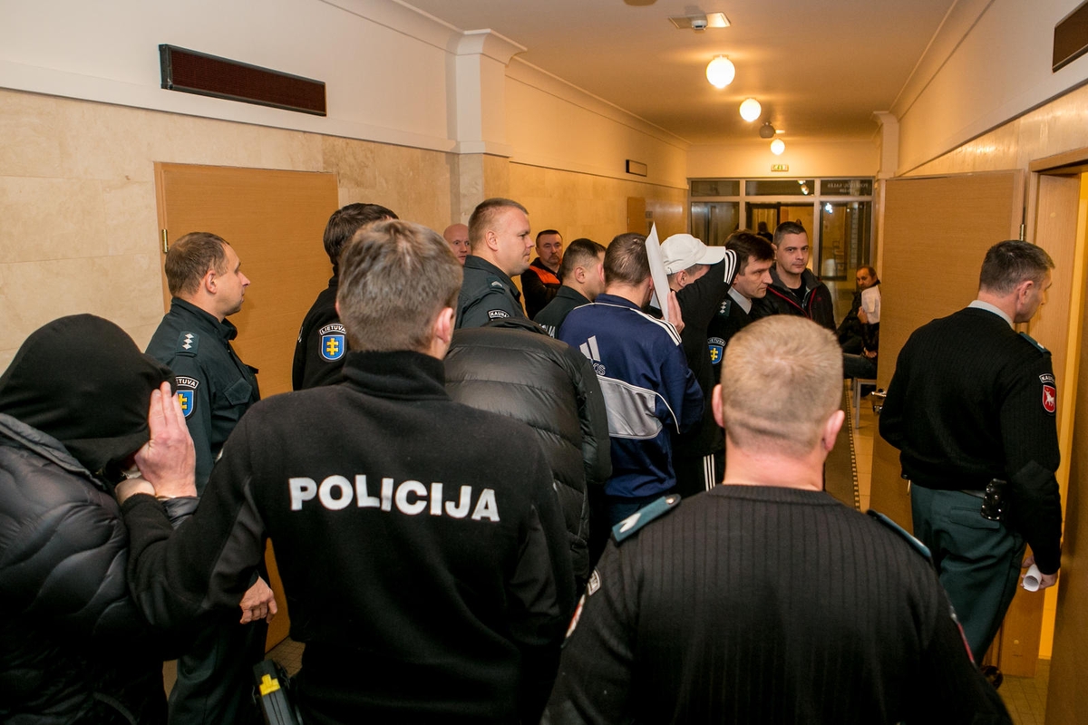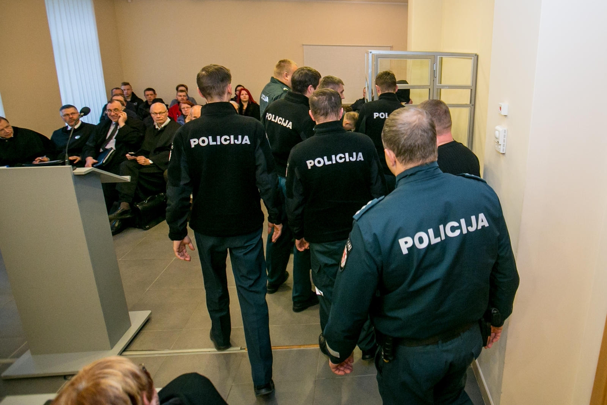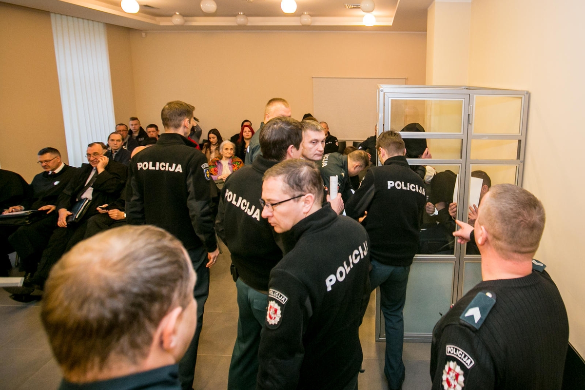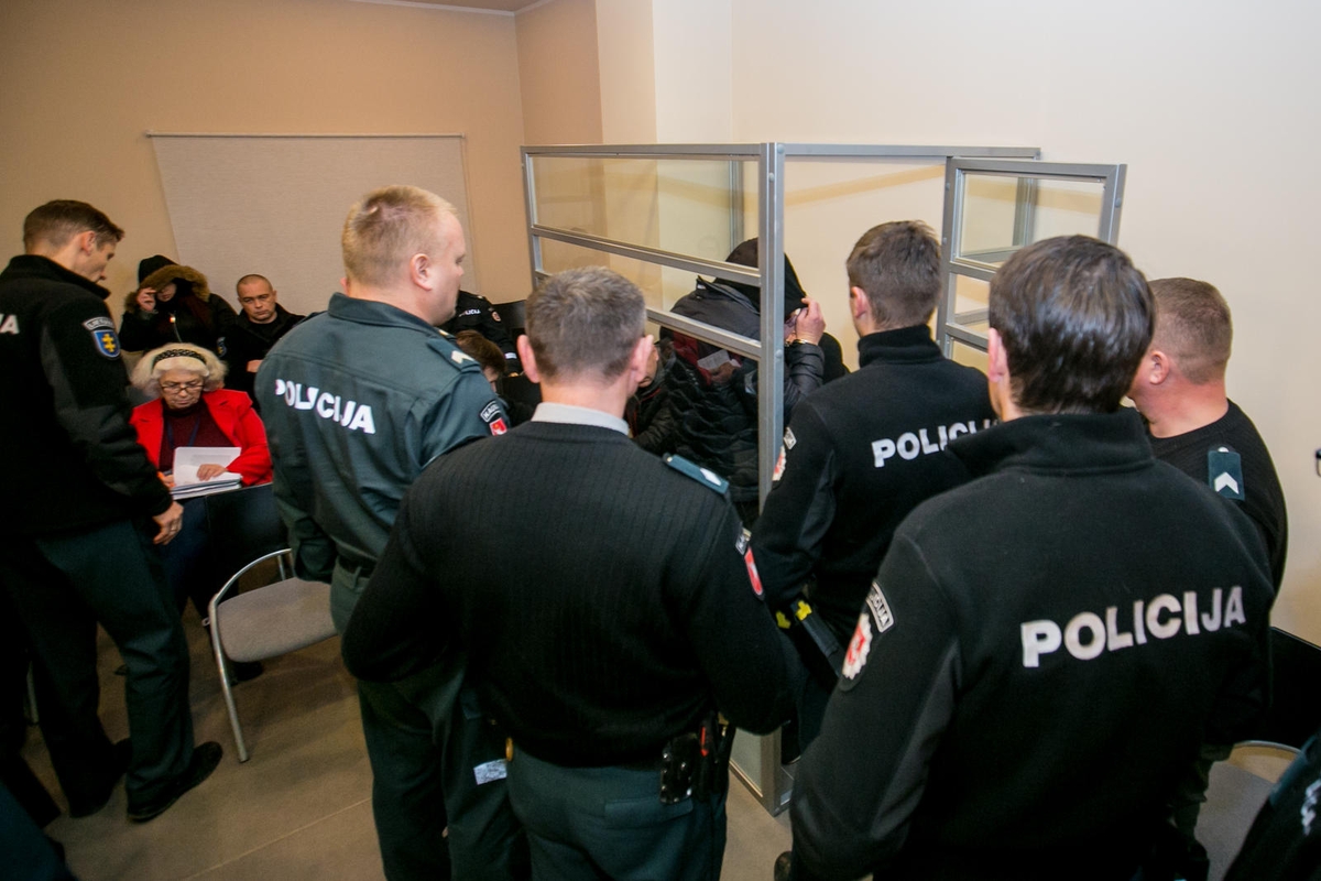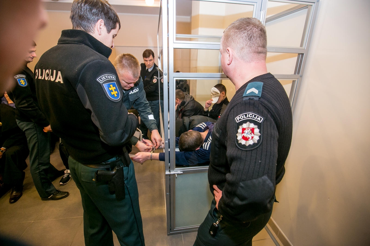Kartu su juo į posėdį su antrankiais pristatyti dar keturi už grotų nuosprendžio laukiantys kaltinamieji netilpo į teismo salės narvą. Kaip ir pastarųjų bei laisvėje esančių teisiamųjų advokatai jiems skirtose vietose.