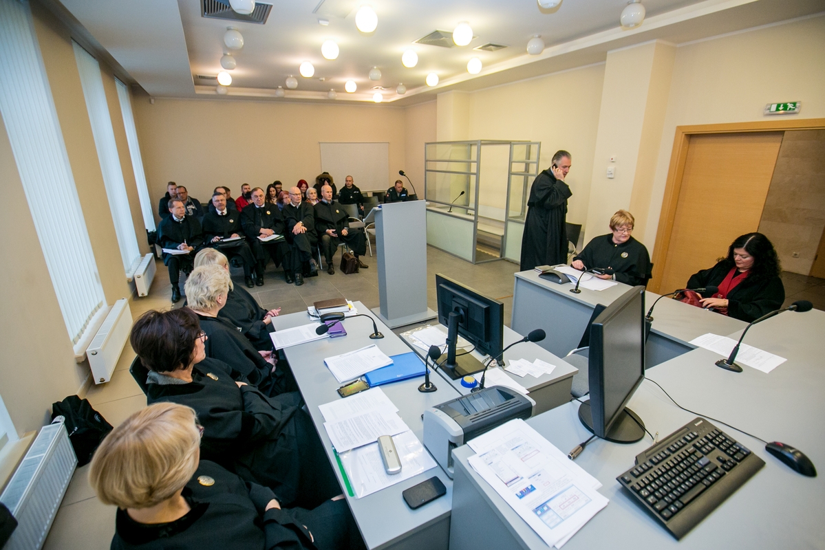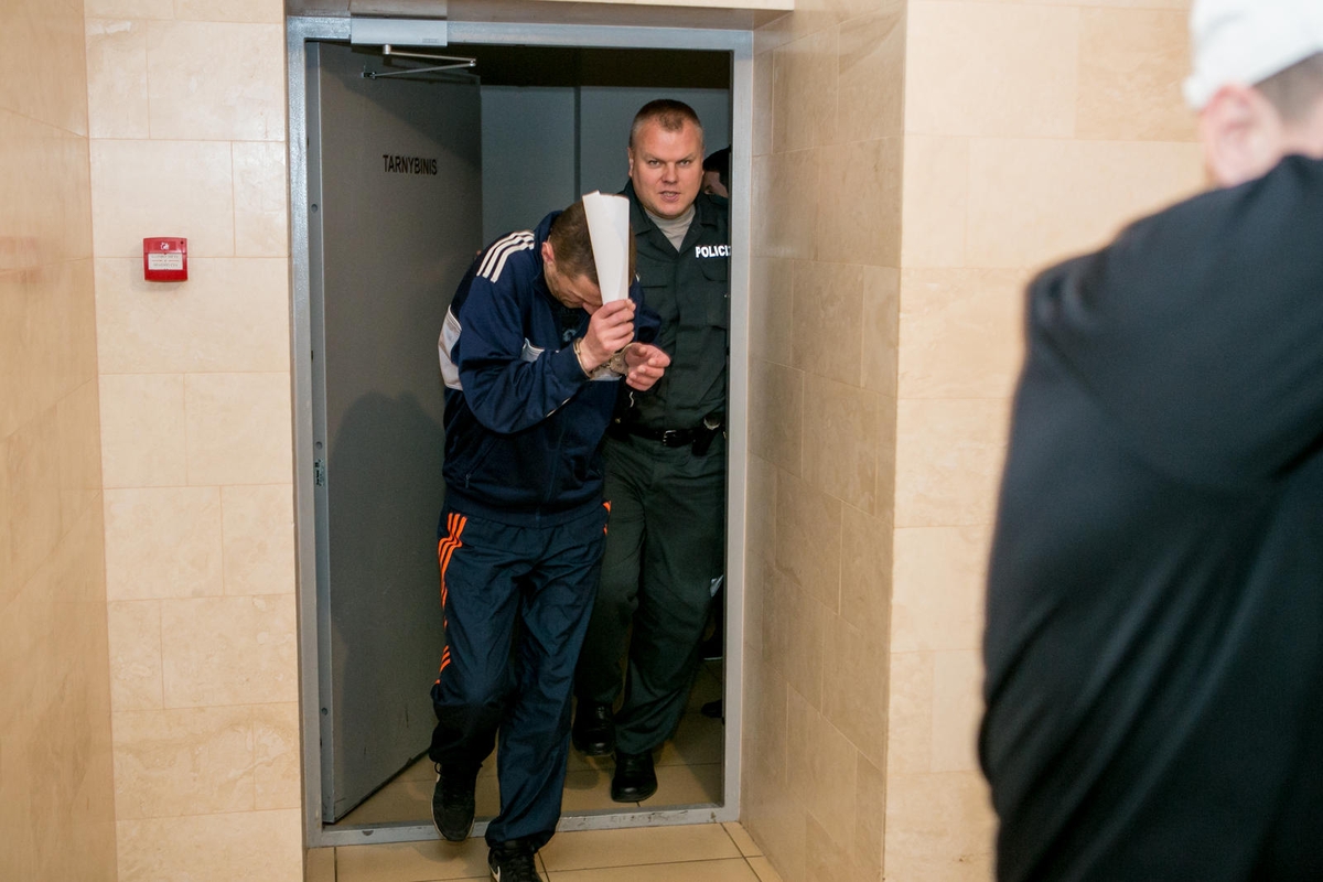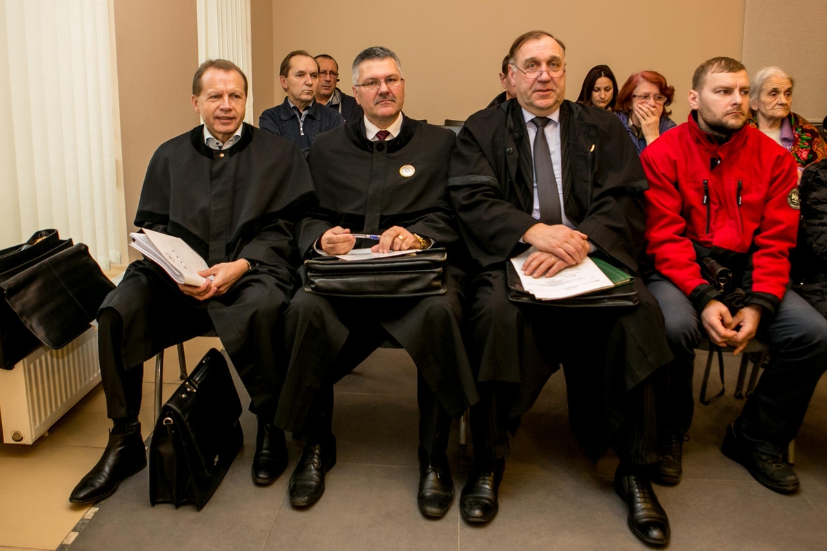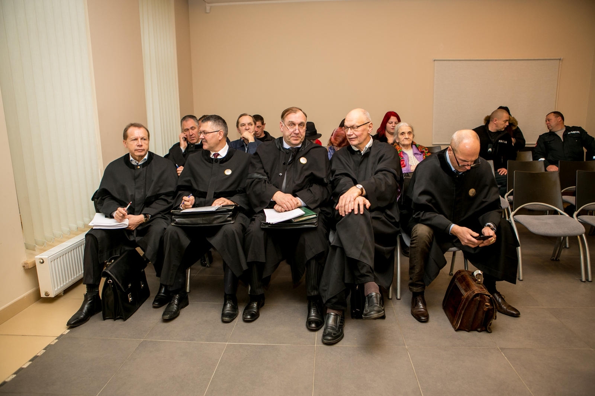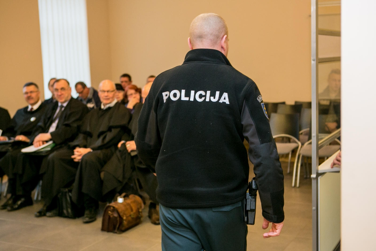 Kartu su juo į posėdį su antrankiais pristatyti dar keturi už grotų nuosprendžio laukiantys kaltinamieji netilpo į teismo salės narvą. Kaip ir pastarųjų bei laisvėje esančių teisiamųjų advokatai jiems skirtose vietose.