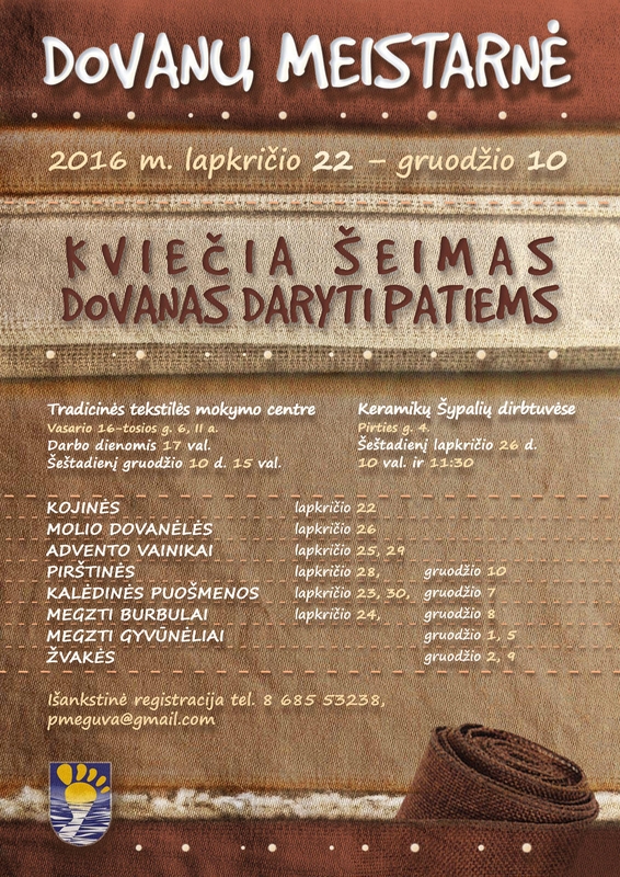 Nemokami užsiėmimai vyks Tradicinės tekstilės mokymo centre (Vasario 16-osios g. 6, II aukšte) darbo dienomis nuo 17 val, o gruodžio 10 d., šeštadienį – nuo 15 val. O Keramikų Šypalių dirbtuvėse (Pirties g. 4) užsiėmimai vyks lapkričio 26 d. 10 val. bei 11.30 val.