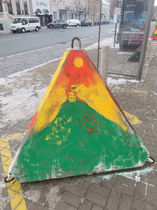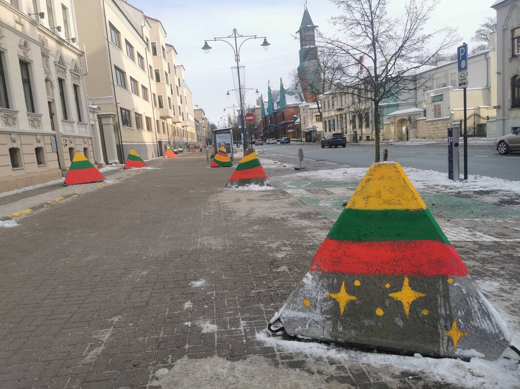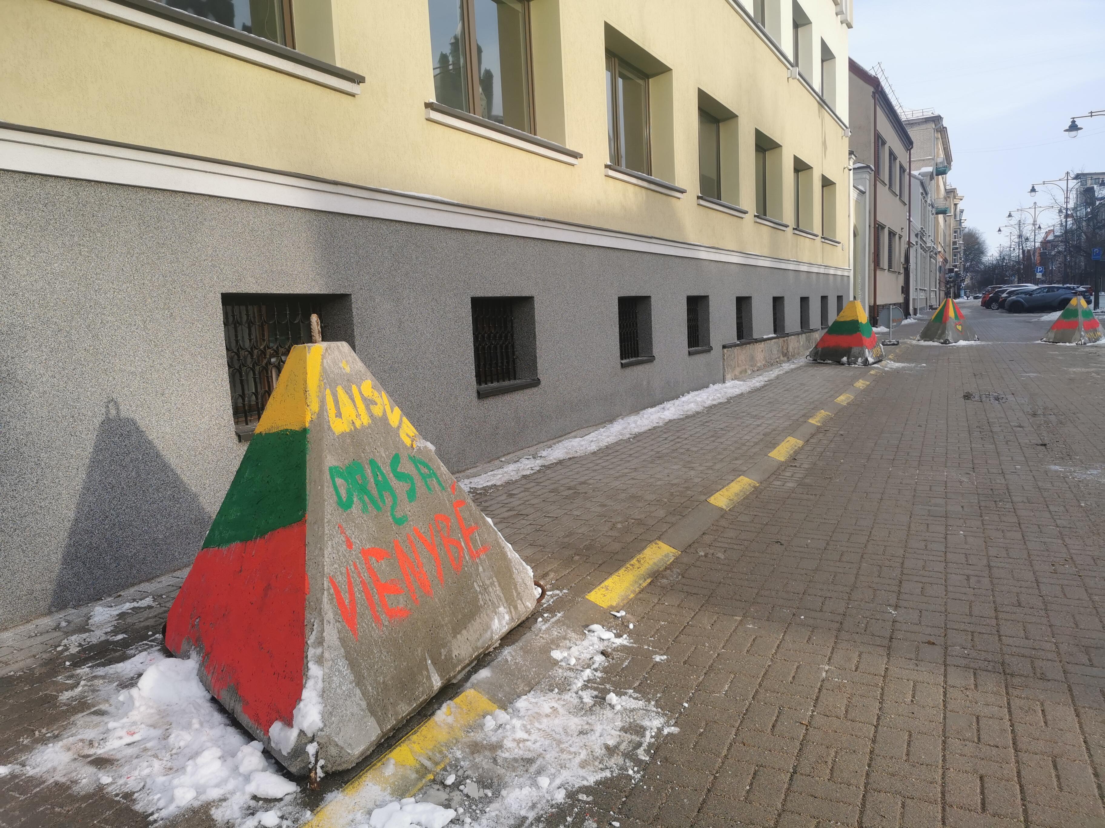 Prie Klaipėdos savivaldybės pastato atvežti pilki betoniniai barjerai virto spalvingais piešiniais – vaikai sukūrė atvirą parodą, skirtą Laisvės gynėjų dienai.