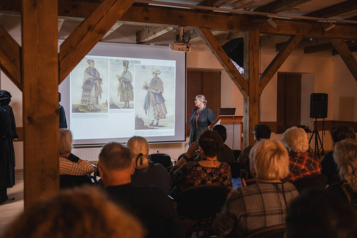 Klaipėdos etnokultūros centro salėje – pristatomi keturi D. Tomkuvienės atkurti Mažosios Lietuvos moteriški viršutiniai rudens – žiemos sezono drabužiai: sermėgėlė (poveris), puspaltis (žakets), moteriškas švarkas (jupa), moteriškas švarkas pamuštas kailiu (kailinė jopė).