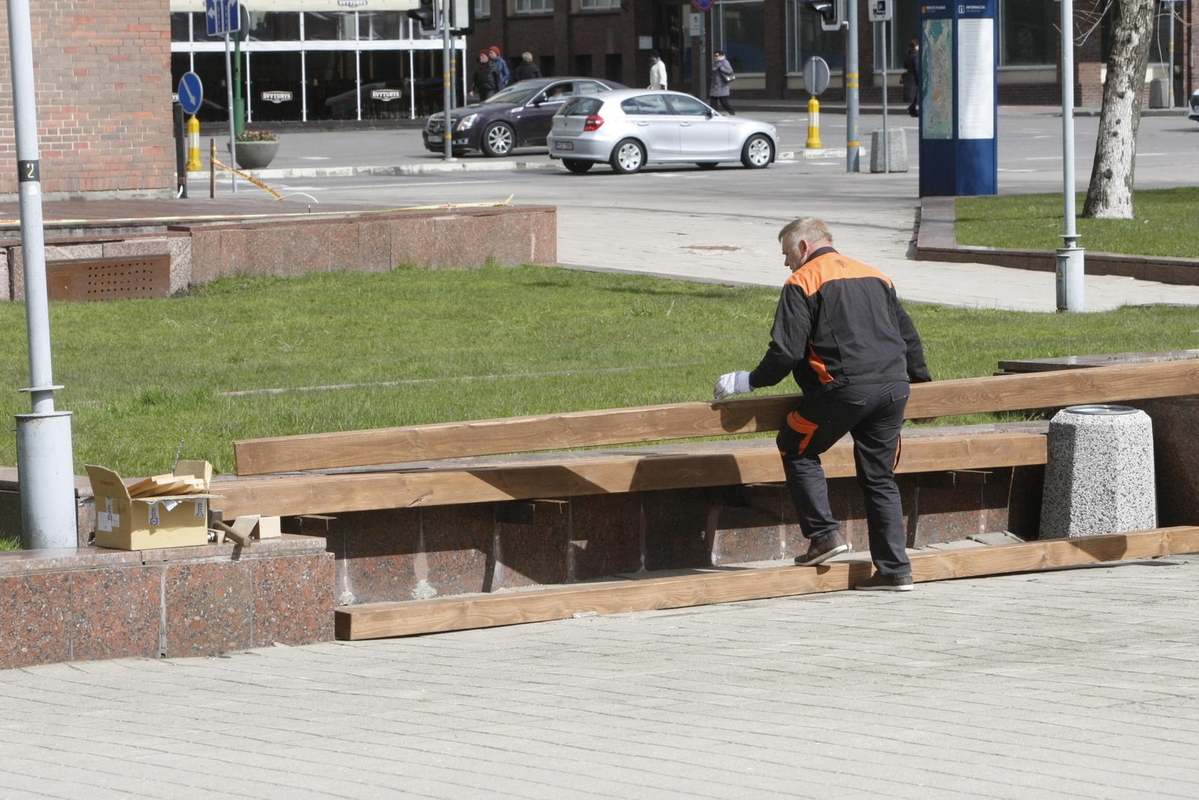 Atgimimo aikštėje plušėjo darbininkai. Buvo keičiamos suolų medinės konstrukcijos. Klaipėdos savivaldybės Miesto ūkio departamento direktorius Liudvikas Dūda atskleidė, kad darbų imtasi, nes sulaukta pastabų iš gyventojų.