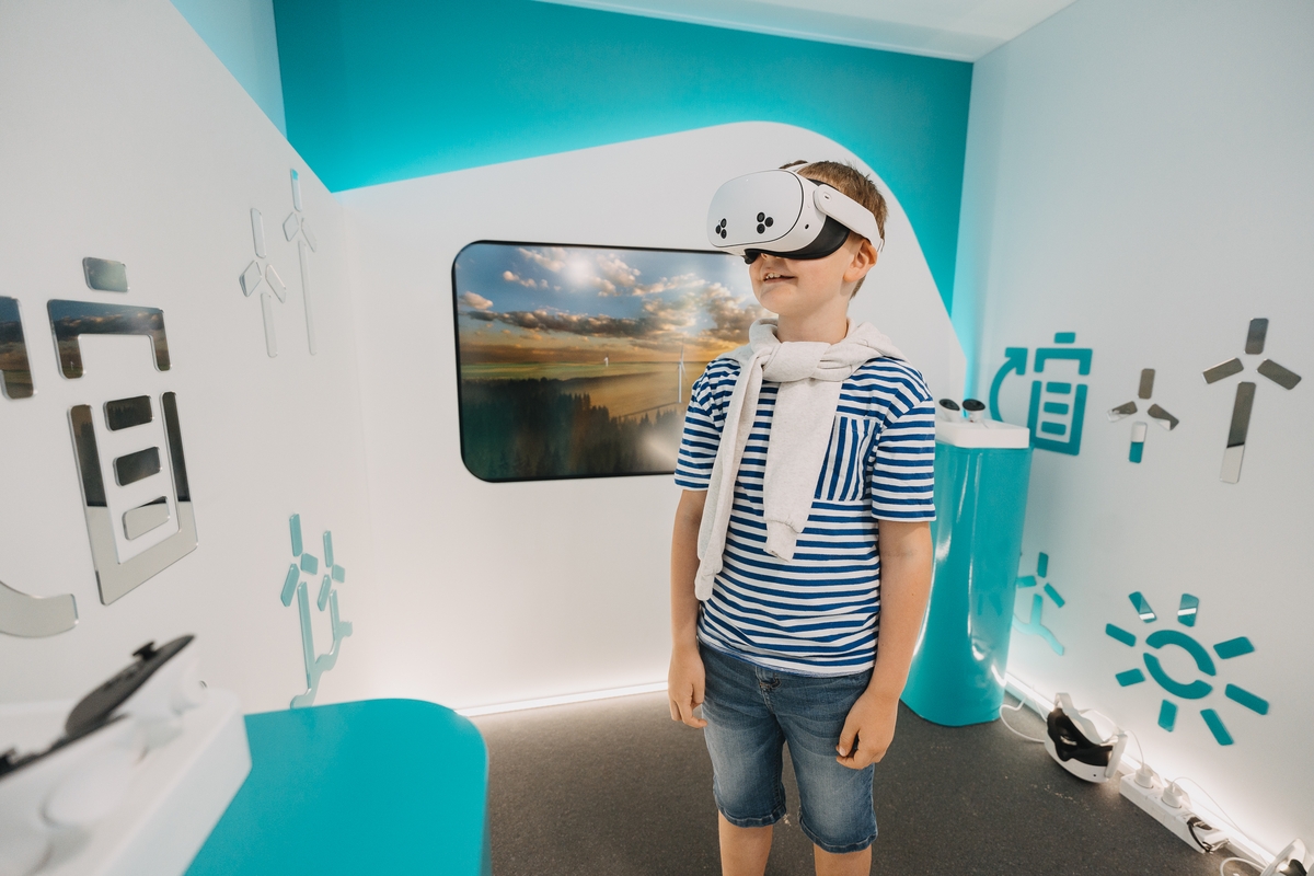 Dar vienas erdvės akcentas – virtualios realybės akiniai. Jie leidžia pakilti į maždaug 160 metrų aukštį, į vėjo elektrinės viršūnę, ir patirti jos mastą iš arti.