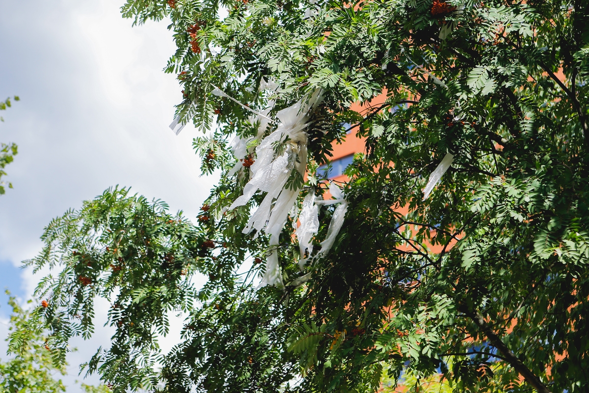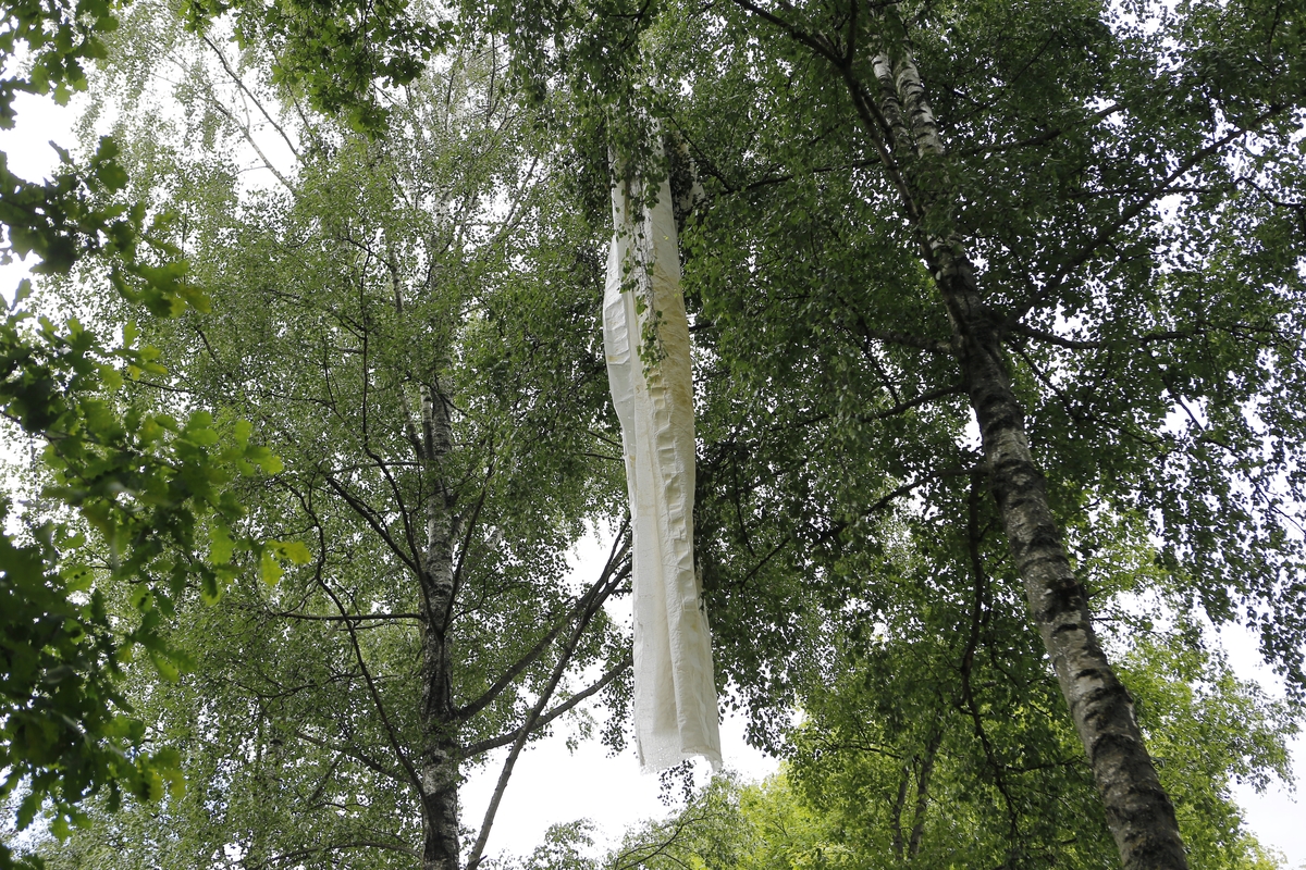 Šalia Ažuolų giraitės gyvenantis Zigmas pasakojo, kad apie 12 metrų ilgio ir pusantro metro pločio medžiagos gabalas ant medžio, augančio prie vaikų lopšelio-darželio "Klevelis", pakibo prieš dvi savaites. Toks pats pastebėtas ir kitame plačiašakyje netoli įstaigos.
