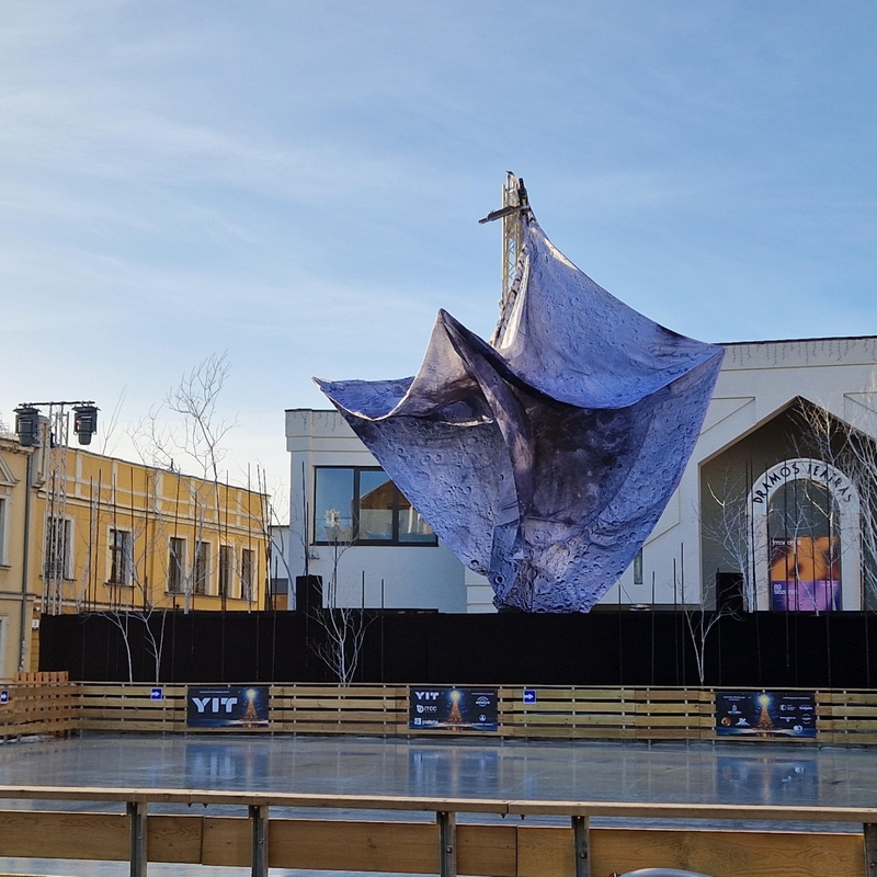 Klaipėdoje gūsingo vėjo neatlaikė ir kalėdinė puošmena – mėnulio instaliacija Klaipėdos Teatro aikštėje prie ledo čiuožyklos – ji subliuško.