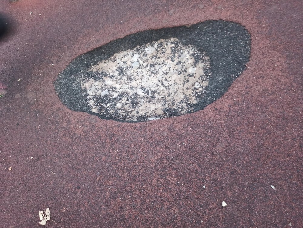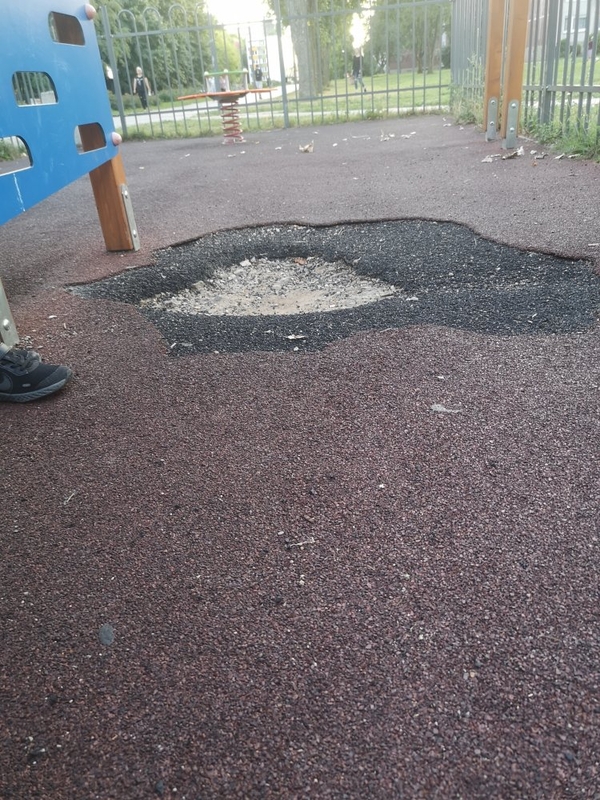 Šią aikštelę vaikai aktyviai lanko, tad mama pastebėjo, jog aikštelės danga kai kuriose vietose yra nusidėvėjusi iki cemento.