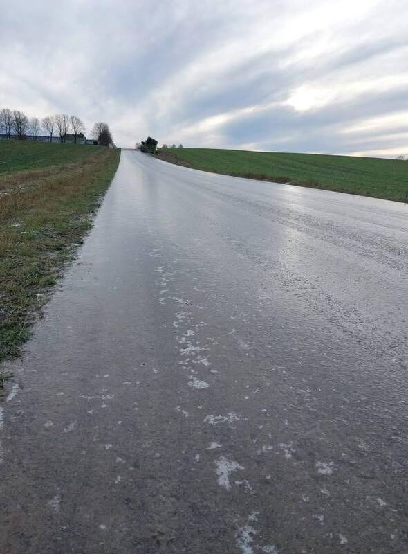 Nuotraukose užfiksuota ypač pavojinga kelio danga – aiškiai matomas kelią sukaustęs plikledis, dėl kurio net ir nedidelis greitis gali tapti pavojingas.