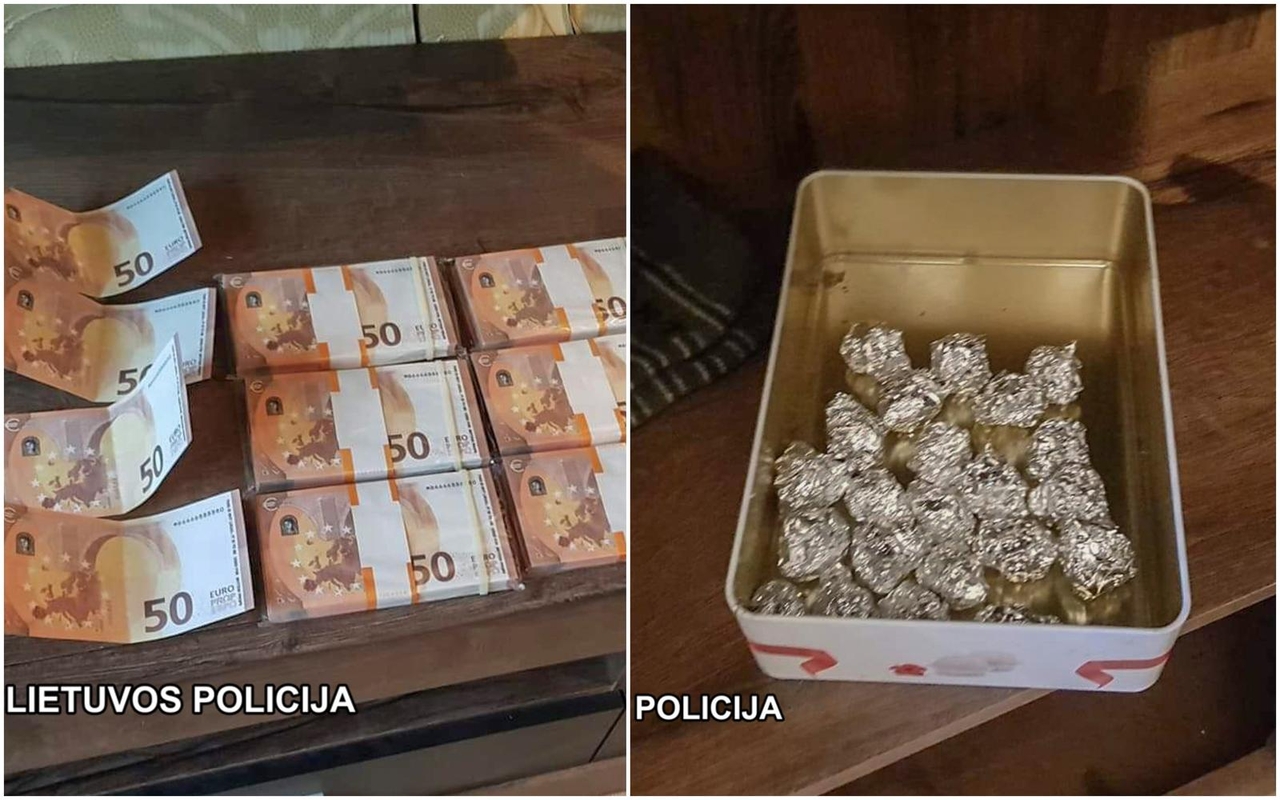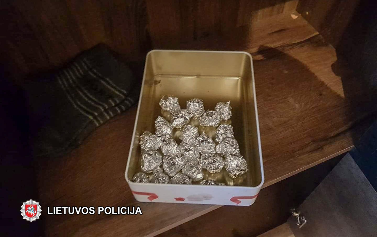 Įtariamojo bute pareigūnai taip pat aptiko du indus su 35 folijos lankstinukais, kuriuose supakuota augalinės kilmės medžiaga, manoma, narkotikai.