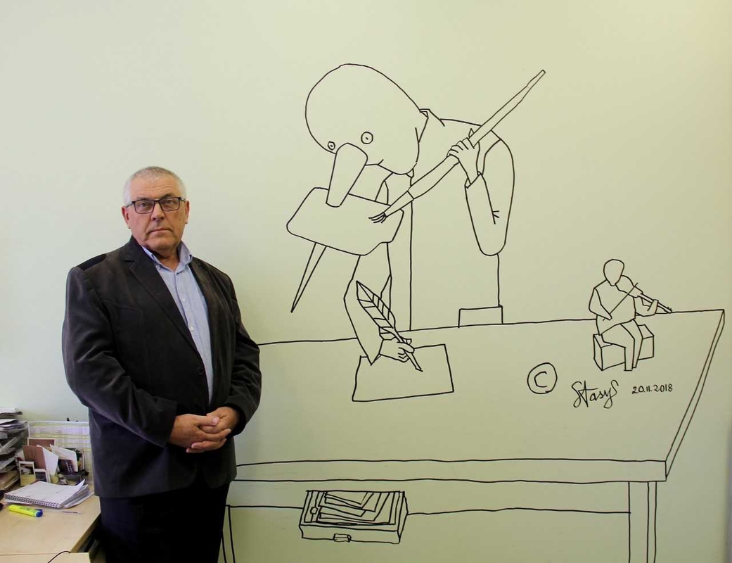 Būtent ant šios specialistės kabineto sienos ir „apsigyveno“ S.Eidrigevičiaus sukurtas personažas – ir rašytojo plunksna, ir dailininko teptuku „ginkluotas“ žmogeliukas, kurį rašyti ir piešti įkvepia šalia muzikuojantis smuikininkas.