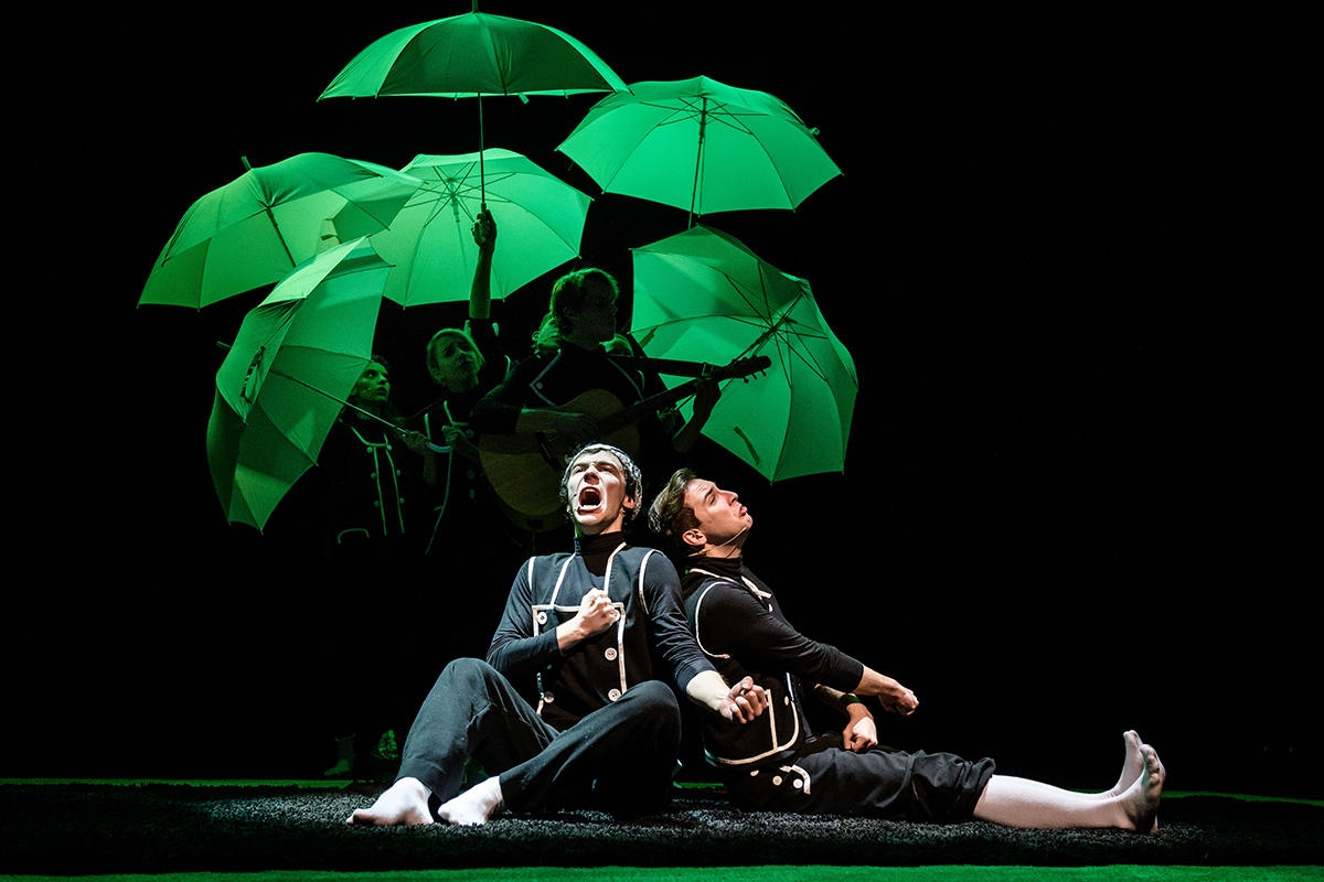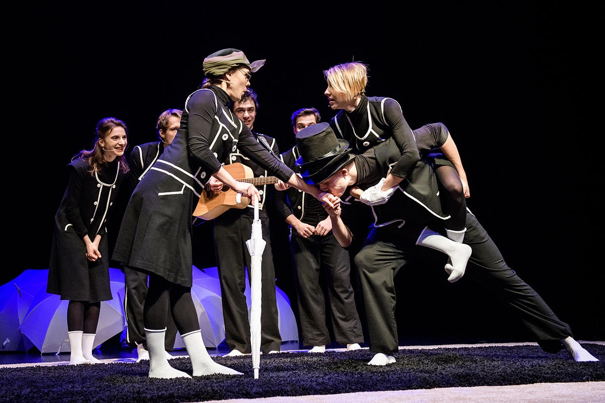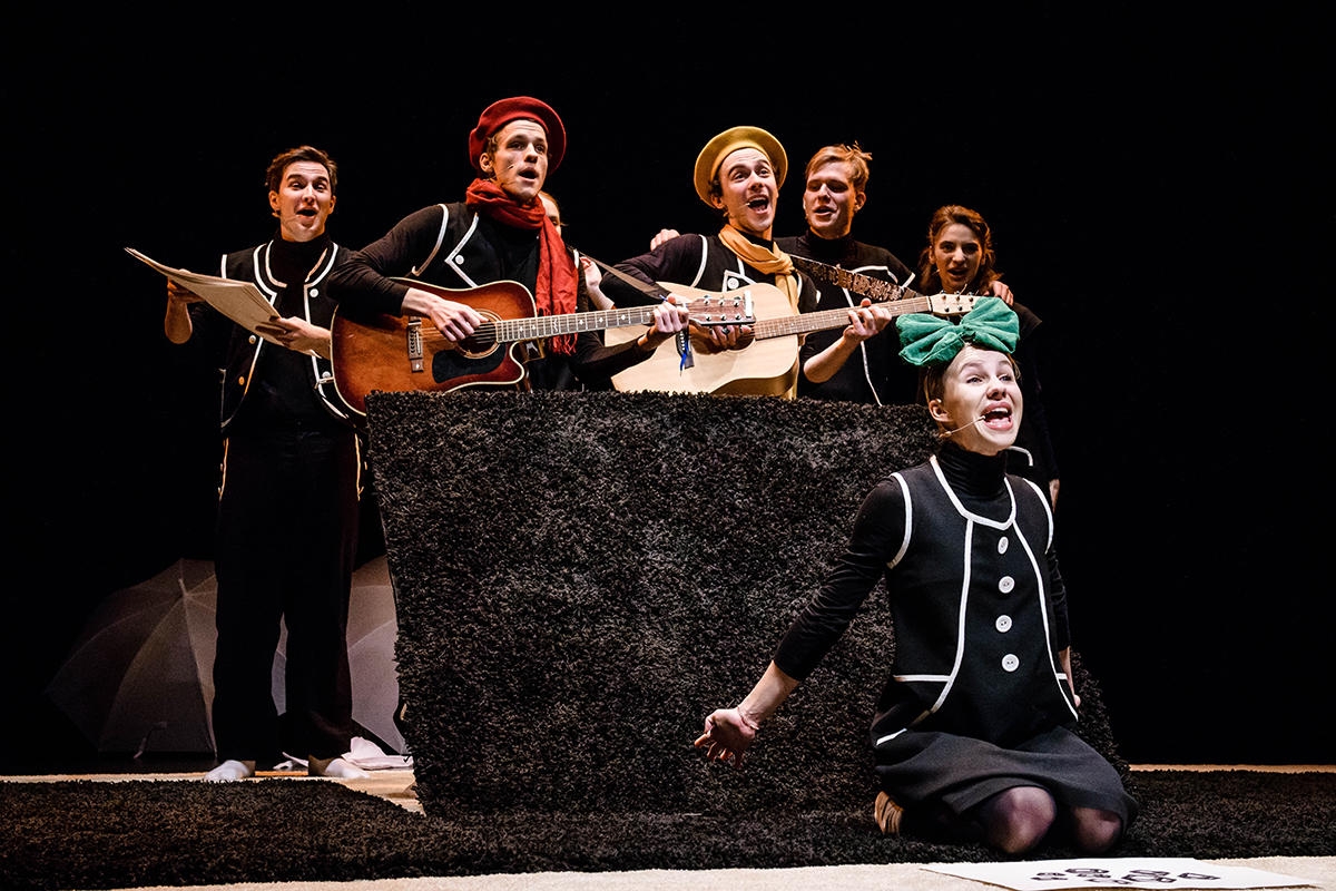 Nuotaikingame muzikiniame spektaklyje ritmą muša, gitaras prakalbina ir istorijas pasakoja visas būrys jaunųjų Keistuolių – Lietuvos muzikos ir teatro akademijos vaidybos studentų. Kai kuriuos iš jų teatro žiūrovai jau spėjo pažinti kituose Keistuolių teatro spektakliuose bei koncertuose, o kai kuriems tai – pirmasis pasirodymas didžiojoje scenoje. Energingi, talentingi ir be galo skirtingi aktoriai nė kiek nepanašūs į atsargius teatro naujokus – „HOP!” kūrybinė komanda Donaldo Bisseto pasakas scenoje atgaivina su jaunatvišku šėlsmu ir įsimintinomis dainomis, kurias dar ilgai norisi niūniuoti ir užvėrus teatro duris.