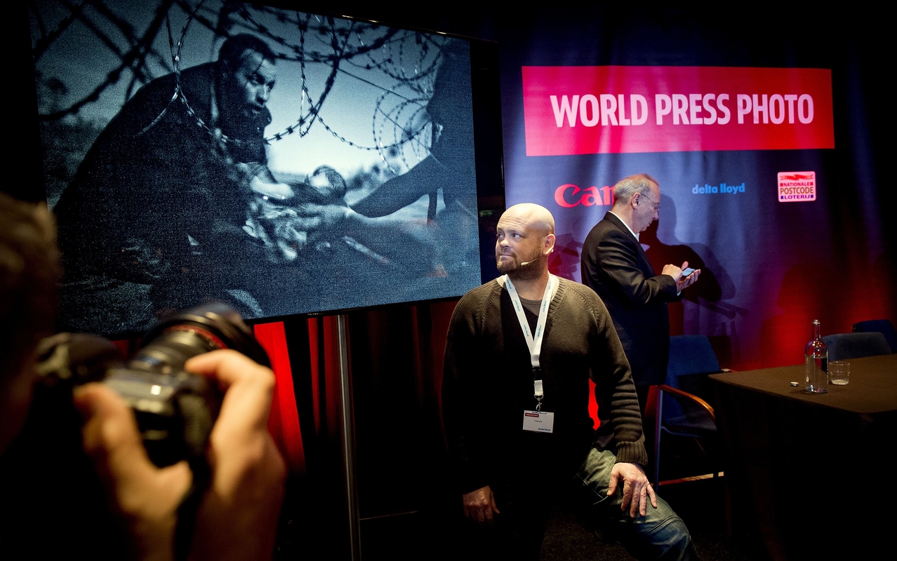 Jaudinanti nespalvota nuotrauka, kurioje matoma, kaip pabėgėlis perduoda kūdikį per spygliuotos vielos tvorą, ketvirtadienį pelnė Pasaulio metų spaudos fotografijos (World Press Photo, WPP) pagrindinį apdovanojimą,