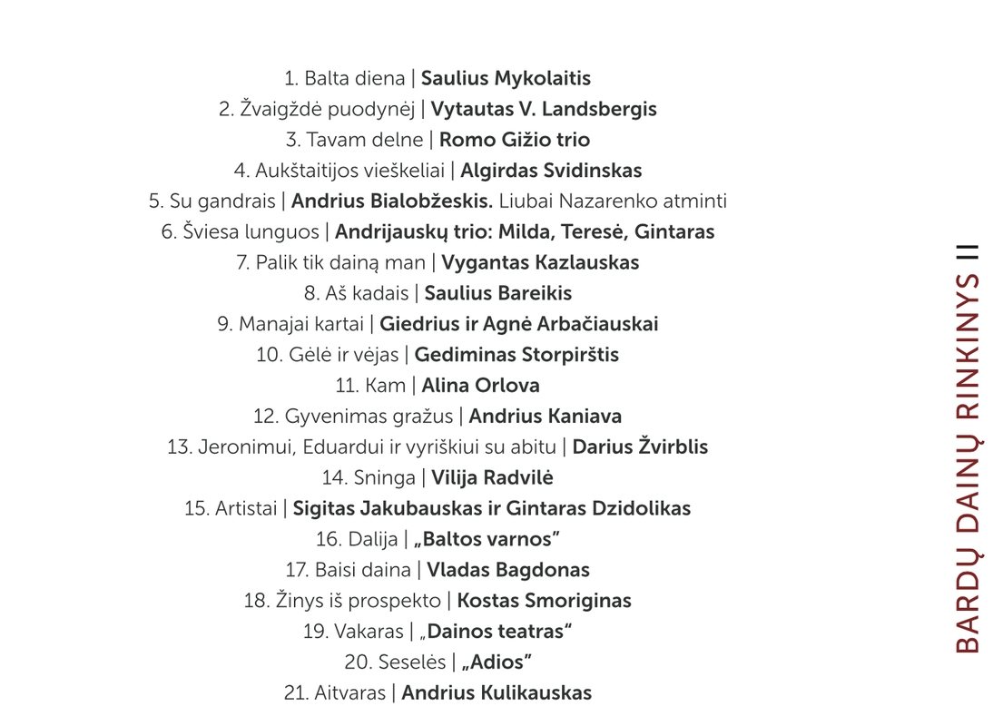 Naujas Lietuvos bardų dainų rinkinys tarsi spalvotas žanro kaleidoskopas, kuriame pristatomi tiek patį žanrą formavę kūrėjai – „Dainos teatras“, grupė „Adios“ su Andriumi Kulikausku, Sauliumi Bareikiu bei Olegu Ditkovskiu, Vladas Bagdonas, Kostas Smoriginas, Sigitas Jakubauskas su Gintaru Dzidoliku ir kiti, tiek jaunieji, praplėtę žanro ribas, atlikėjai – Alina Orlova, Darius Žvirblis, „Baltos varnos“. Šis rinkinys liudija svarbius ir įdomius pokyčius bardų muzikoje.