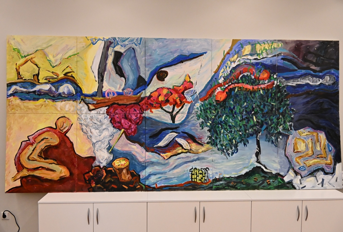 „Jei būtų taip paprasta, tuomet nutapyčiau geltonai mėlyną paveikslą ir viskas stotų į savo vietas“, – ironizuoja pašnekovas ir atvirauja, kad tapymas sekina. Ypač kai pradeda tapyti didelę kompoziciją. Eskizą jai būna pasidaręs prieš gerus du mėnesius. Tada laukia, kol pagamins drobes. Nekantrauja. Užtai kai gauna, visą 7 m kompoziciją nutapo vienu ypu per savaitę!