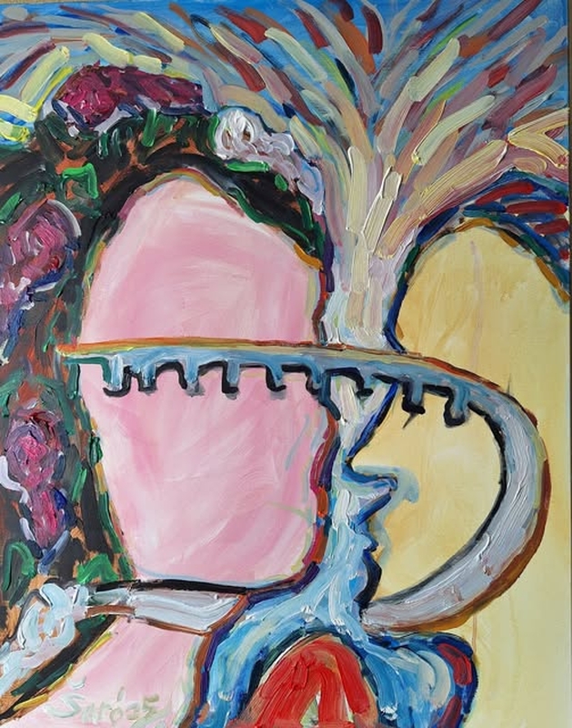 „Šiame paveiksle matome raudoną stalą, ant kurio stovi du puodeliai. Viename puodelyje juodas skystis, kitame – mėlynas. Raudona spalva kuria įtampą. Juodas skystis simbolizuoja santykių pabaigą, mėlynas skystis – ramybę. Jis išeina, o ji pasilieka. Jo puodelis juodas, jos – mėlynas. Galima spėti, kad išsiskyrimas, santykių nutraukimas grąžina jai ramybę“, – spalvų simboliką aiškina Šaro ir priduria, kad kiekvienas potėpis, spalva, forma abstrakčiajame simbolizme tampa simboliniu ženklu, turinčiu gilesnę prasmę.