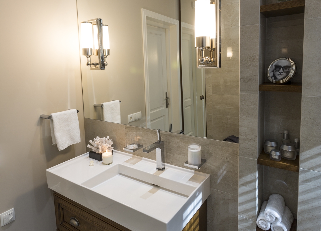 Didžiajame sanitariniame mazge naujai įrengta dušinė – gana erdvi ir prabangi, čia užteko vietos ir patogiam suoliukui. Tai nestandartinis sprendimas, kaip ir vandens nuleidimo mygtukas, dengtas sieninėmis plytelėmis. Sienų apdailai naudotos blizgios marmuro imitacijos akmens masės plytelės, grindims tokios pačios, tik nepoliruotos, kad nebūtų slidu. Spalvos pilkšvai rusvos, kaip ir kitose patalpose.