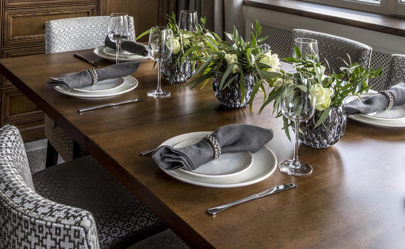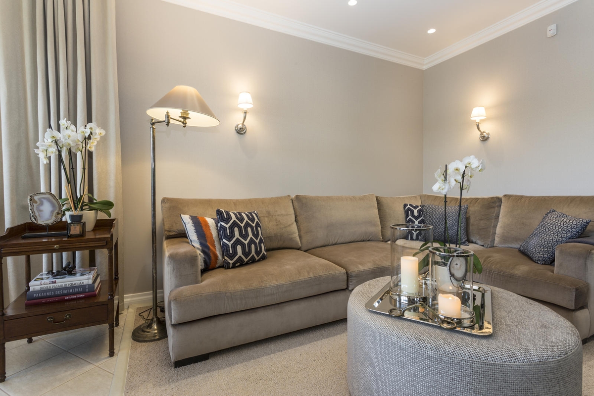 „Siekiant suteikti klasikinio elegantiškumo ties lubomis naujai išklijuoti karnizai. Sušildyti valgomojo ir svetainės erdvę padeda vilnoniai kilimai. Kartu jie funkciškai atskiria šias zonas. Virtuvė gana siaura ir gerai matoma iš svetainės, tad ant vienos sienos pakabintas dekoratyvus veidrodis, vizualiai didinantis patalpą“, – teigia architektė. Svetainei erdvumo suteikia šviesios spalvos, žemesni baldai.