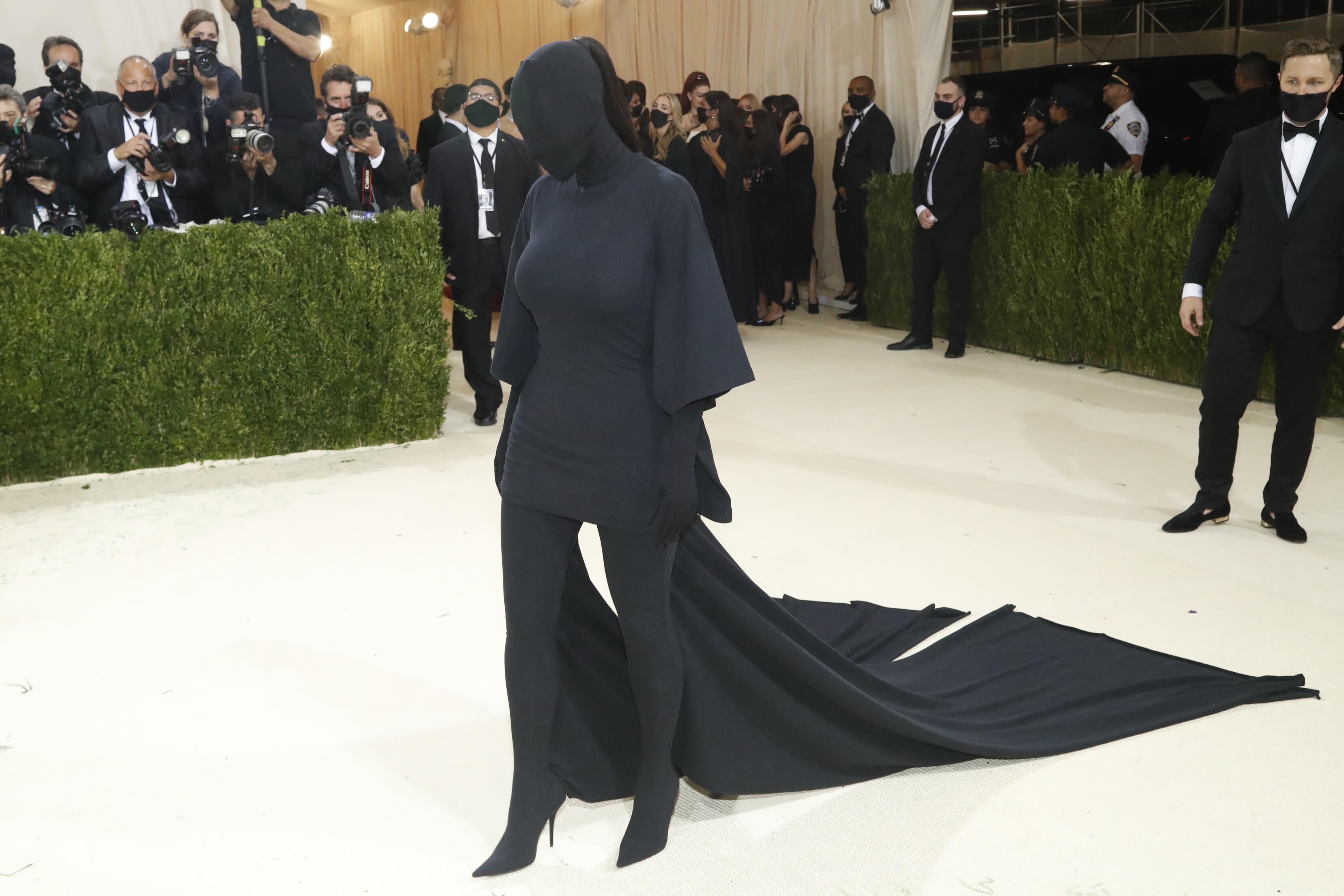 Tai ne pirmas kartas, kai K. Kardashian demonstruoja beveidį įvaizdį. 2021 m. „Met Gala“ vakarėlyje ji pasirodė vilkėdama nuo galvos iki kojų juodą „Balenciaga“ ansamblį.