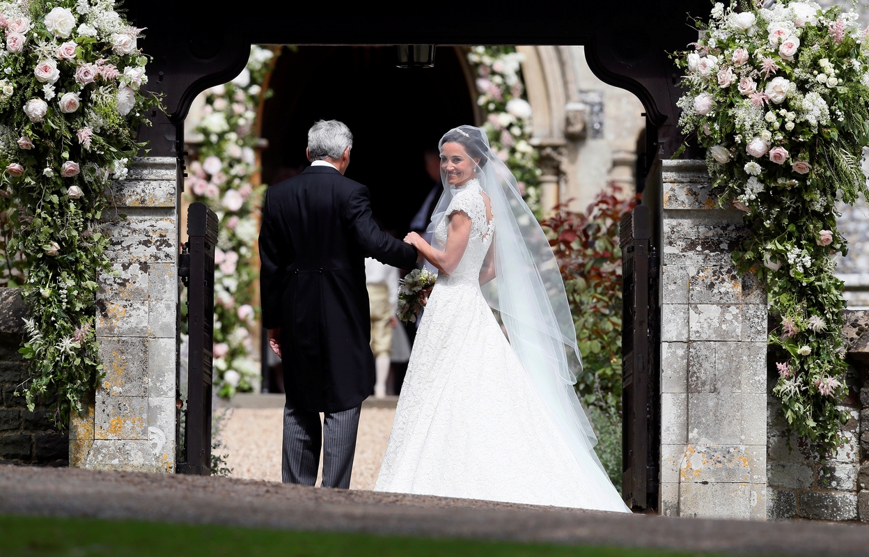 33 metų P.Middleton, kuri vilkėjo specialiai jai siūdintą britų dizainerio Gileso Deacono (Džailso Dikono) suknelę, ir 41 metų finansininko Jameso Matthewso (Džeimso Metjuzo) vestuvėse, be kitų svečių, dalyvauja karališkoji pora Kate ir Williamas, teniso žvaigždė Rogeris Federeris (Rodžeris Federeris).