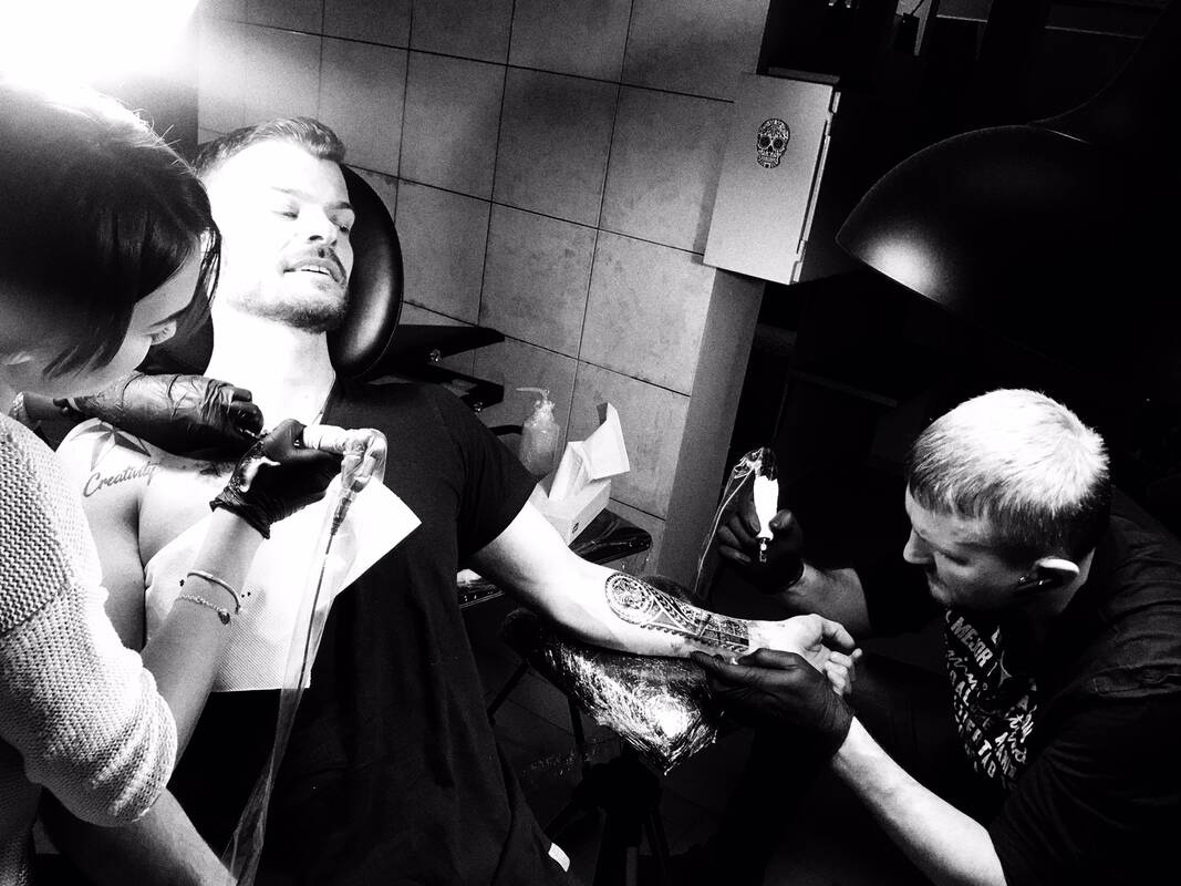 „Atėjau ir laukiau savo kliento, tačiau jis nepasirodė, tada Mindaugas parodė man piešinio nuotrauką telefone ir sako – ar padarysi? Iš pradžių maniau, kad jis juokauja. Žinoma, šiek tiek jaudinausi, bet jaudinuosi visada prieš darydama tatuiruotes, nes dar nedaug praktikos turiu. Vis dėlto Mindaugo tatuiruotė puikiai pavyko, patiko ir jam, ir meistras apžiūrėjęs gyrė, kad viską gerai padariau“, – įspūdžiais dalijosi Evelina, svajojanti kada nors ištatuiruoti žmogaus portretą, kuriam reikia ypatingo kruopštumo ir profesionalumo.