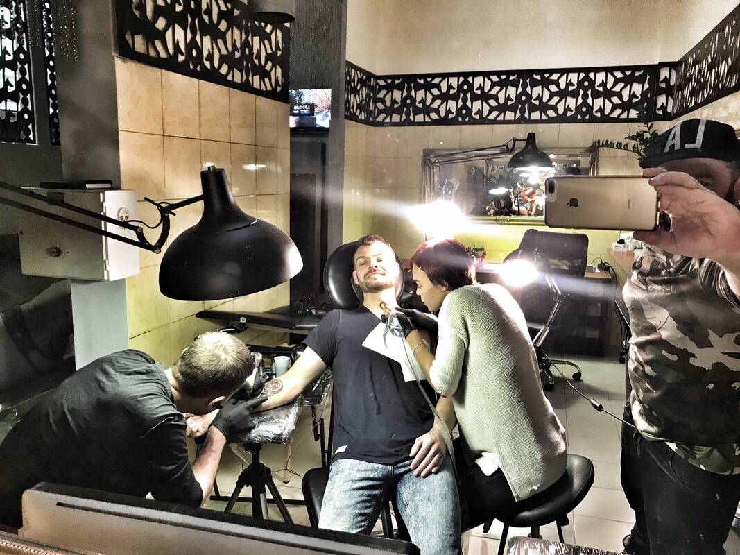 Per antrąjį tatuiravimo seansą į studiją atėjo „Golden Age“ atlikėja Evelina. Taip Mindaugas sužinojo, kad mergina mokosi šio amato ir spontaniškai pasiūlė jai ką nors nupiešti jam.
