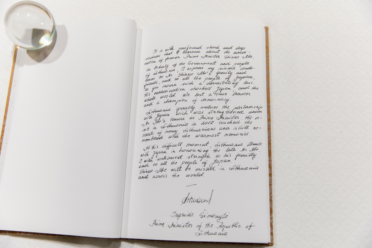 Šią sunkią akimirką Lietuva laikosi išvien su Japonija pagerbdama velionį poną Abe. Linkiu jo šeimai ir visiems Japonijos žmonėms išlikti stipriems. Shinzo Abe pasiges tiek Lietuva, tiek visas pasaulis“, – pabrėžė Vyriausybės vadovė.