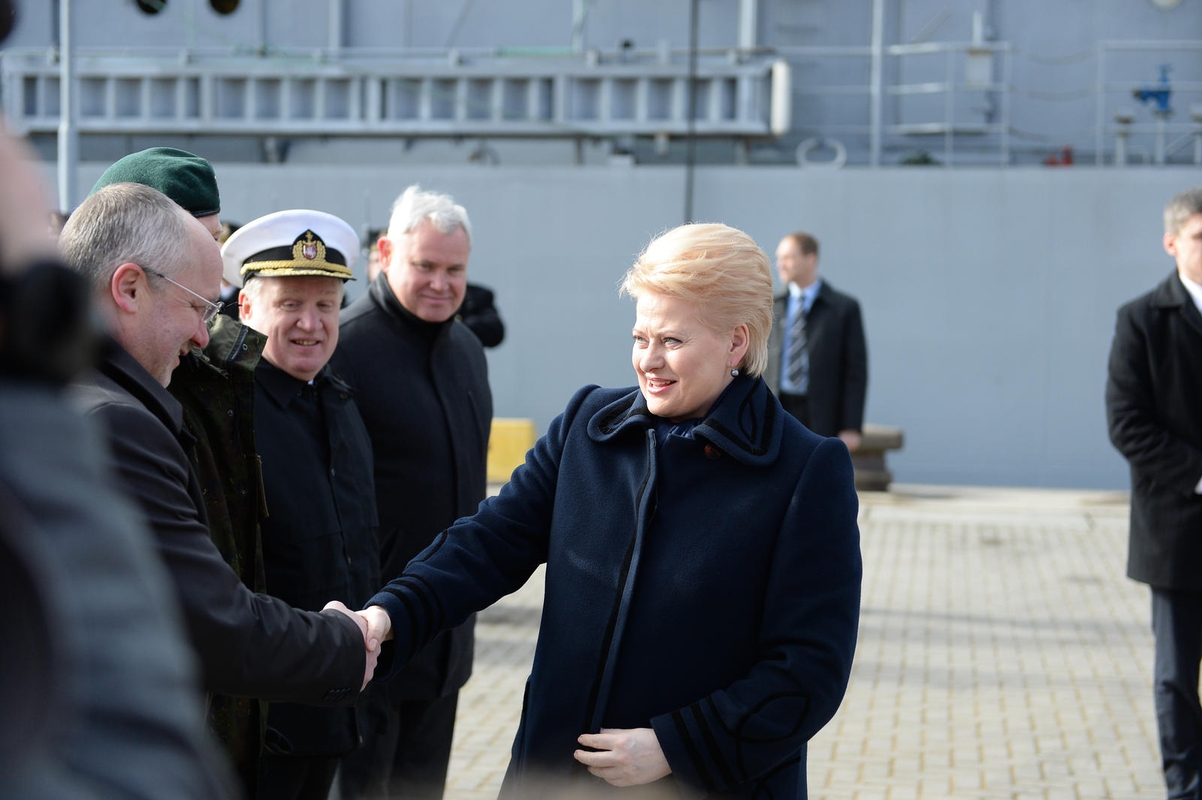 LR prezidentę, atvykusią į Klaipėdos Kruizinių ir karo laivų terminalą, pasitiko krašto apsaugos ministras Juozas Olekas, Lietuvos kariuomenės vadas generolas leitenantas Arvydas Pocius, Karinių jūrų pajėgų vadas flotilės admirolas Kęstutis Macijauskas, Garbės sargybos būrys.