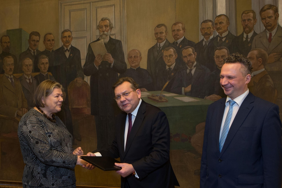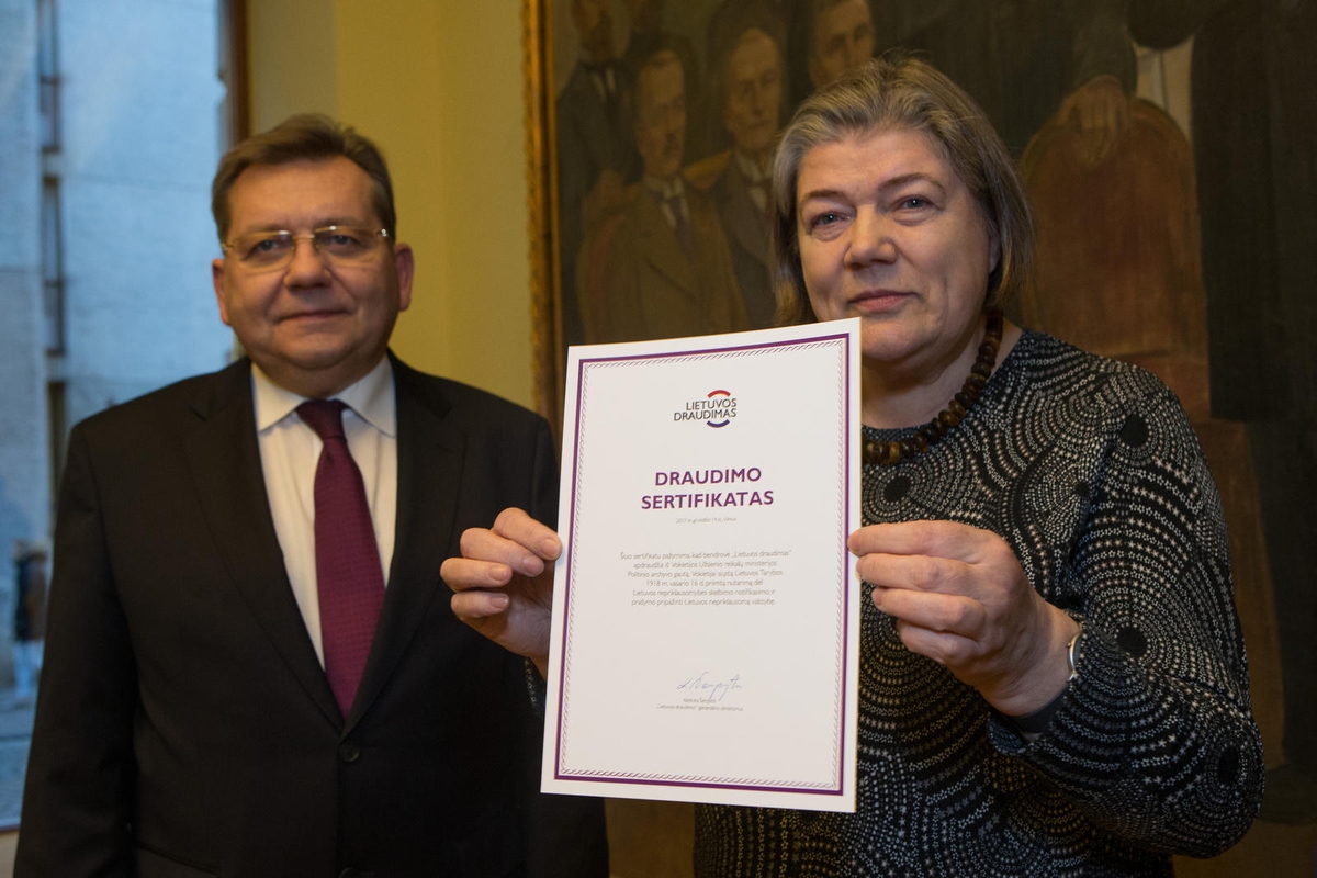 Šiandien Signatarų namuose, esančiuose Vilniuje, Nepriklausomybės akto draudimo sertifikatą „Lietuvos draudimo“ generalinis direktorius Kęstutis Šerpytis įteikė Lietuvos vyriausiajam archyvarui dr. Ramojui Kraujeliui ir Lietuvos nacionalinio muziejaus direktorei Birutei Kulnytei.